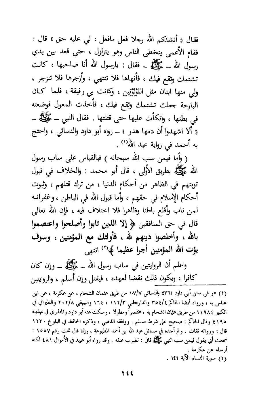 فقال: «أنشدكم الله رجلا فعل ما فعل، لي عليه حق» قال: فقام الأعمى يتخطى الناس وهو يتزلزل، حتى قعد بين يدي رسول الله - صَلَّى اللَّهُ عَلَيْهِ وَسَلَّمَ - فقال: يا رسول الله أنا صاحبها، كانت تشتمك وتقع فيك، فأنهاها فلا تنتهي، وأزجرها فلا تنزجر، ولي منها ابنان مثل اللؤلؤتين، وكانت بي رفيقة، فلما كان البارحة جعلت تشتمك وتقع فيك، فأخذت المعول فوضعته في بطنها، واتكأت عليها حتى قتلتها. فقال النبي - صَلَّى اللَّهُ عَلَيْهِ وَسَلَّمَ -: «ألا اشهدوا أن دمها هدر» رواه أبو داود والنسائي، واحتج به أحمد في رواية عبد الله.