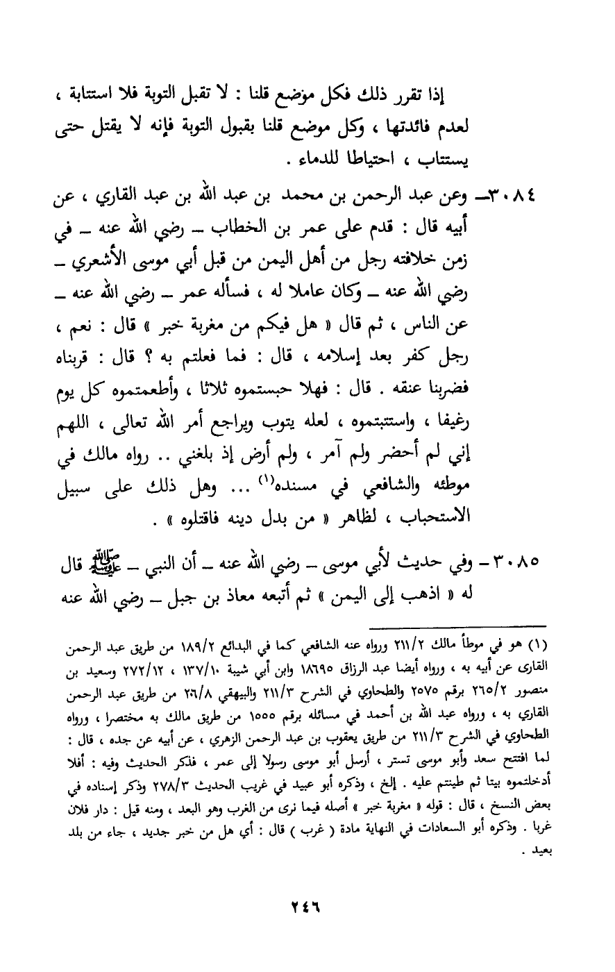 3084 - وعن عبد الرحمن بن محمد بن عبد الله بن عبد القاري، عن أبيه قال: قدم على عمر بن الخطاب - رَضِيَ اللَّهُ عَنْهُ - في زمن خلافته رجل من أهل اليمن من قبل أبي موسى الأشعري - رَضِيَ اللَّهُ عَنْهُ -، وكان عاملا له، فسأله عمر - رَضِيَ اللَّهُ عَنْهُ - عن الناس، ثم قال: «هل فيكم من مغربة خبر» قال: نعم، رجل كفر بعد إسلامه، قال: فما فعلتم به؟ قال: قربناه فضربنا عنقه. قال: فهلا حبستموه ثلاثا، وأطعمتموه كل يوم رغيفا، واستتبتموه، لعله يتوب ويراجع أمر الله تعالى، اللهم إني لم أحضر ولم آمر، ولم أرض إذ بلغني. . . رواه مالك في موطئه والشافعي في مسنده. . . وهل ذلك على سبيل الاستحباب، لظاهر «من بدل دينه فاقتلوه» .