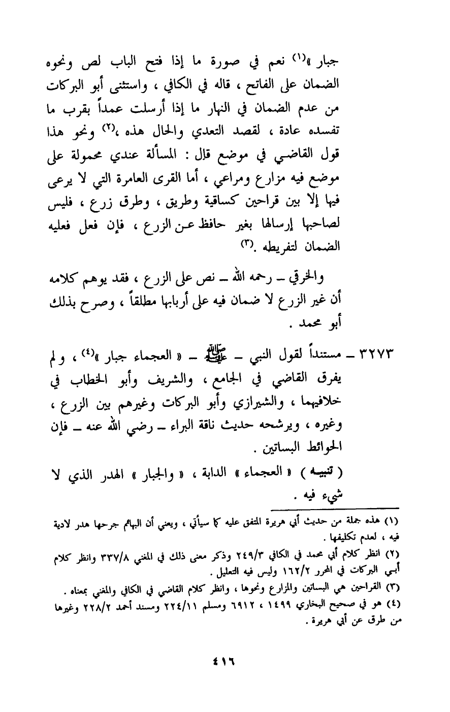 3273 - مستندا لقول النبي - صَلَّى اللَّهُ عَلَيْهِ وَسَلَّمَ -: «العجماء جبار» ، ولم يفرق القاضي في الجامع، والشريف وأبو الخطاب في خلافيهما، والشيرازي وأبو البركات وغيرهم بين الزرع، وغيره، ويرشحه حديث ناقة البراء - رَضِيَ اللَّهُ عَنْهُ -، فإن الحوائط البساتين.