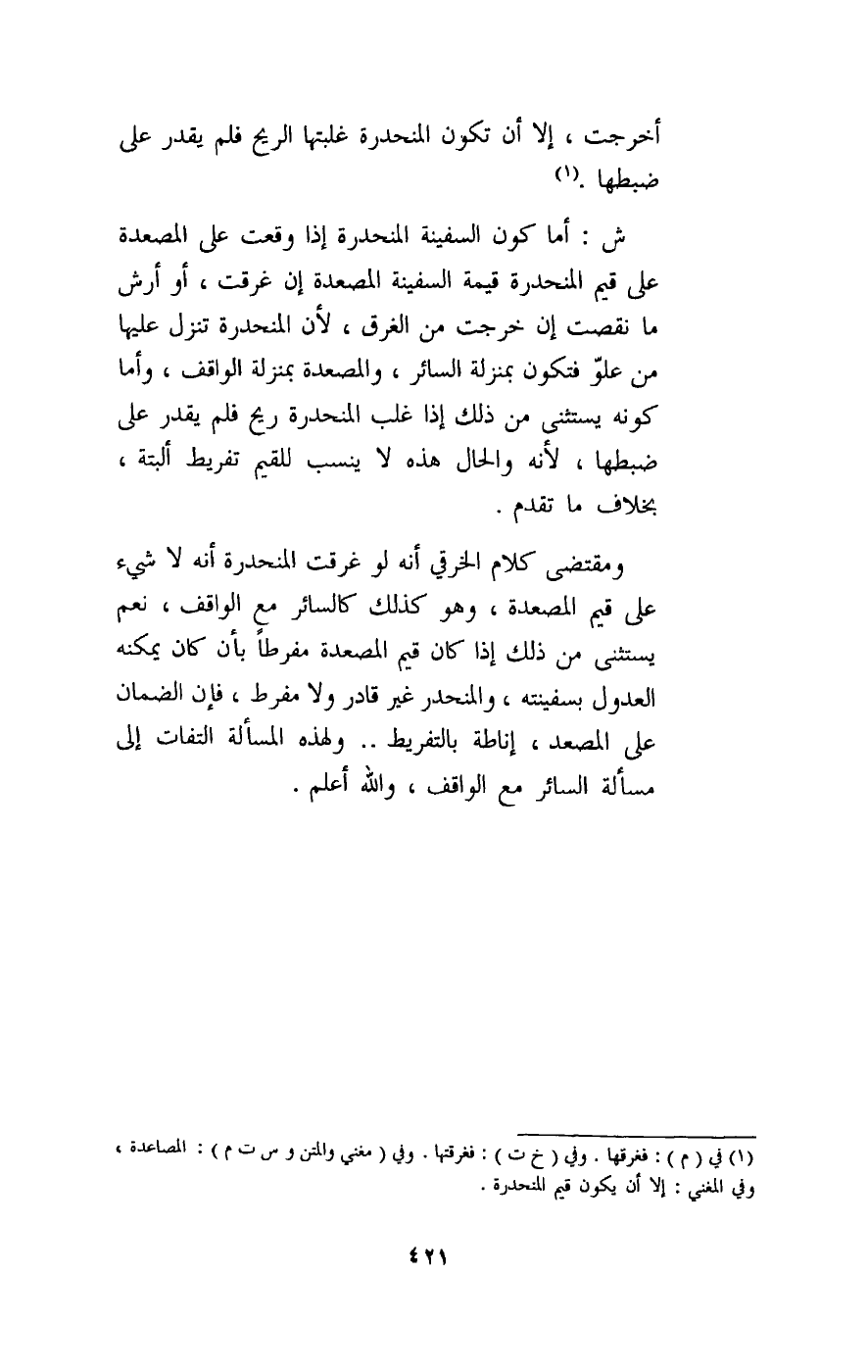 ش: أما كون السفينة المنحدرة إذا وقعت على المصعدة على قيم المنحدرة قيمة السفينة المصعدة إن غرقت، أو أرش ما نقصت إن خرجت من الغرق، لأن المنحدرة تنزل عليها من علو فتكون بمنزلة السائر، والمصعدة بمنزلة الواقف، وأما كونه يستثنى من ذلك إذا غلب المنحدرة ريح فلم يقدر على ضبطها، لأنه والحال هذه لا ينسب للقيم تفريط ألبتة، بخلاف ما تقدم. ومقتضى كلام الخرقي أنه لو غرقت المنحدرة أنه لا شيء على قيم المصعدة، وهو كذلك كالسائر مع الواقف، نعم، يستثنى من ذلك إذا كان قيم المصعدة مفرطا بأن كان يمكنه العدول بسفينته، والمنحدر غير قادر ولا مفرط، فإن الضمان على المصعد، إناطة بالتفريط. . . ولهذه المسألة التفات إلى مسألة السائر مع الواقف، والله أعلم.