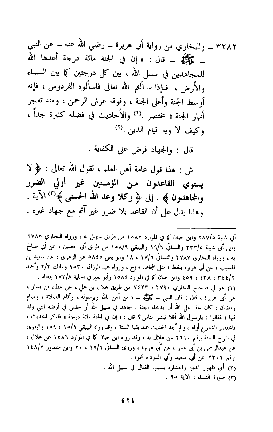 3282 - وللبخاري من رواية أبي هريرة - رَضِيَ اللَّهُ عَنْهُ - عن النبي - صَلَّى اللَّهُ عَلَيْهِ وَسَلَّمَ - قال: «إن في الجنة مائة درجة أعدها الله للمجاهدين في سبيل الله، بين كل درجتين كما بين السماء والأرض، فإذا سألتم الله تعالى فاسألوه الفردوس، فإنه أوسط الجنة وأعلى الجنة، وفوقه عرش الرحمن، ومنه تفجر أنهار الجنة» مختصر. والأحاديث في فضله كثيرة جدا، وكيف لا وبه قيام الدين.