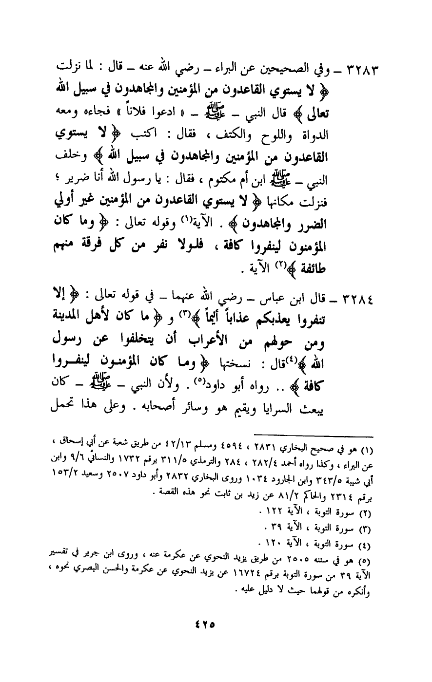 3283 - وفي الصحيحين عن البراء - رَضِيَ اللَّهُ عَنْهُ - قال: «لما نزلت (لا يستوي القاعدون من المؤمنين والمجاهدون في سبيل الله تعالى) قال النبي - صَلَّى اللَّهُ عَلَيْهِ وَسَلَّمَ -: «ادعوا فلانا» فجاءه ومعه الدواة واللوح والكتف، فقال: اكتب (لا يستوي القاعدون من المؤمنين والمجاهدون في سبيل الله) وخلف النبي - صَلَّى اللَّهُ عَلَيْهِ وَسَلَّمَ - ابن أم مكتوم، فقال: يا رسول الله أنا ضرير، فنزلت مكانها: {لَا يَسْتَوِي الْقَاعِدُونَ مِنَ الْمُؤْمِنِينَ غَيْرُ أُولِي الضَّرَرِ وَالْمُجَاهِدُونَ} [النساء: 95] الآية، وقَوْله تَعَالَى: {وَمَا كَانَ الْمُؤْمِنُونَ لِيَنْفِرُوا كَافَّةً فَلَوْلَا نَفَرَ مِنْ كُلِّ فِرْقَةٍ مِنْهُمْ طَائِفَةٌ} [التوبة: 122] الآية.