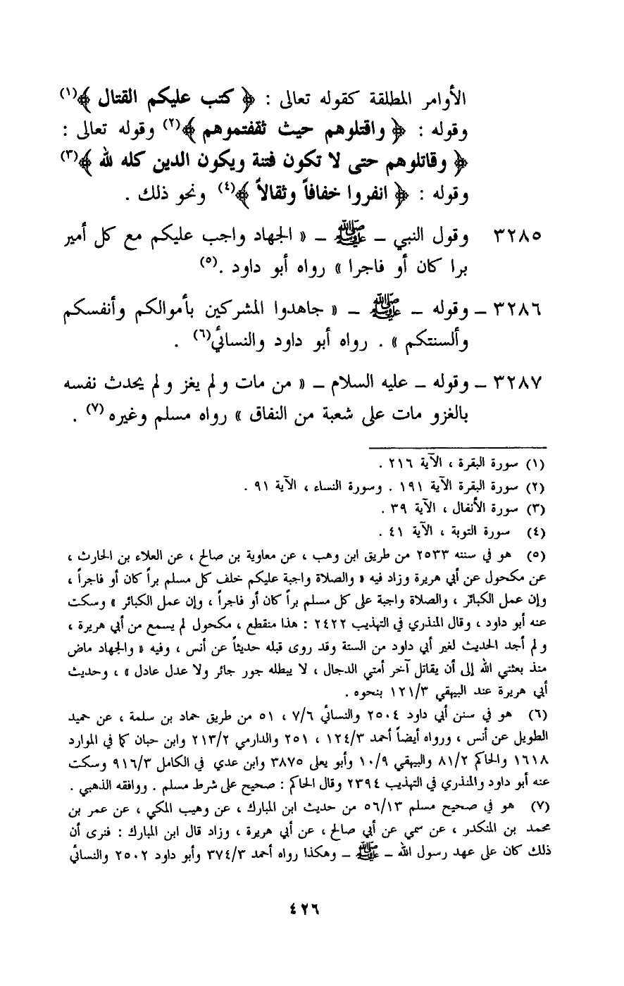 3286 - وقوله: - صَلَّى اللَّهُ عَلَيْهِ وَسَلَّمَ - «جاهدوا المشركين بأموالكم وأنفسكم وألسنتكم» رواه أبو داود والنسائي.