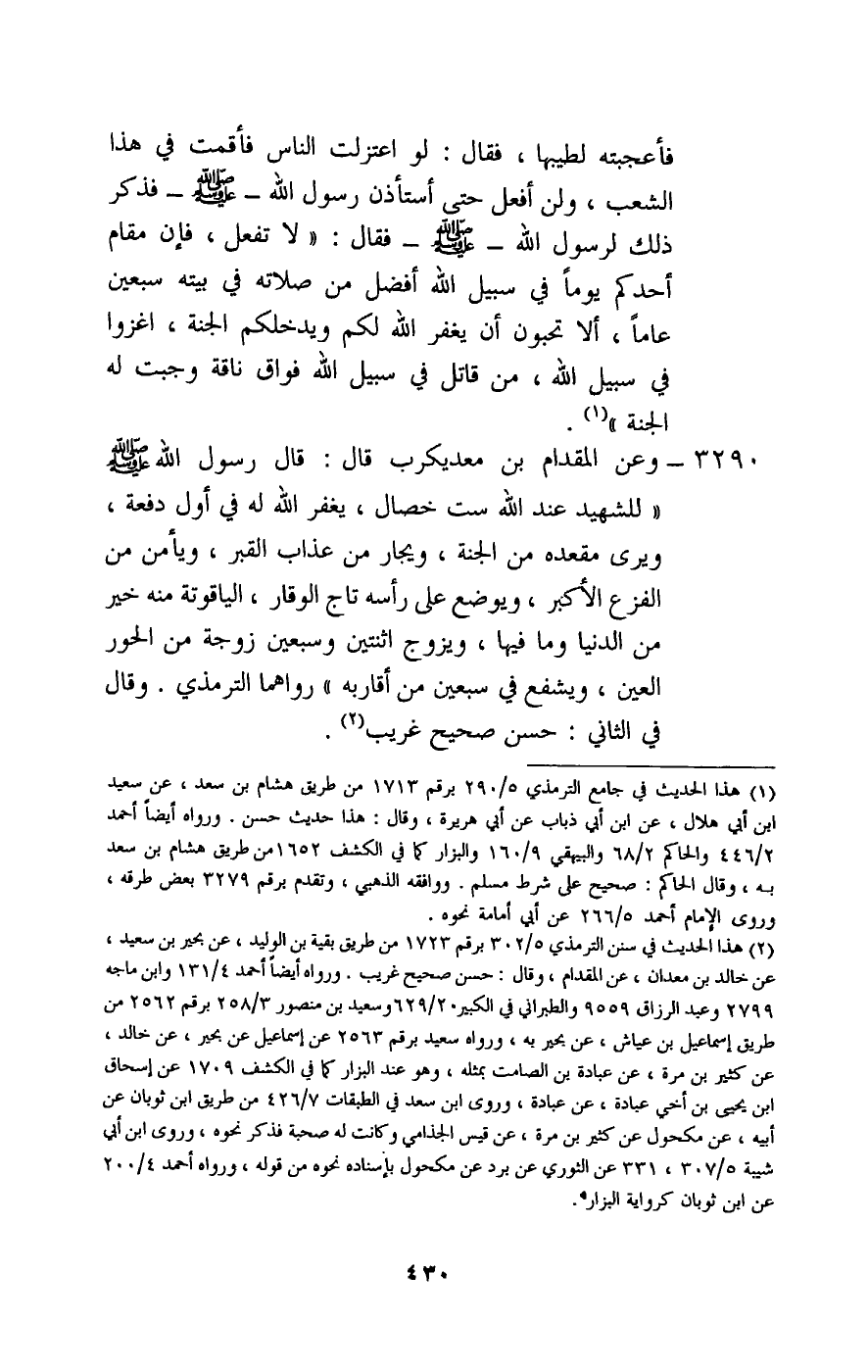 3290 - وعن المقدام بن معديكرب قال: قال رسول الله - صَلَّى اللَّهُ عَلَيْهِ وَسَلَّمَ -: «للشهيد عند الله ست خصال، يغفر الله له في أول دفعة، ويرى مقعده من الجنة، ويجار من عذاب القبر، ويأمن من الفزع الأكبر، ويوضع على رأسه تاج الوقار، الياقوتة منه خير من الدنيا وما فيها، ويزوج اثنتين وسبعين زوجة من الحور العين، ويشفع في سبعين من أقاربه» رواهما الترمذي، وقال في الثاني: حسن صحيح غريب.