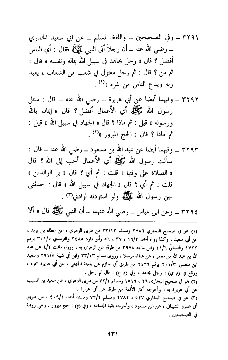 » 3292 - وفيهما أيضا عن أبي هريرة - رَضِيَ اللَّهُ عَنْهُ - قال: «سئل رسول الله - صَلَّى اللَّهُ عَلَيْهِ وَسَلَّمَ - أي الأعمال أفضل؟ قال: «إيمان بالله ورسوله» قيل: ثم ماذا؟ قال: «الجهاد في سبيل الله» قيل: ثم ماذا؟ قال: «الحج المبرور» .» 3293 - وفيهما أيضا «عن عبد الله بن مسعود - رَضِيَ اللَّهُ عَنْهُ - قال: سألت رسول الله - صَلَّى اللَّهُ عَلَيْهِ وَسَلَّمَ - أي الأعمال أحب إلى الله؟ قال: «الصلاة على وقتها» قلت: ثم أي؟ قال: «بر الوالدين» قلت: ثم أي؟ قال: «الجهاد في سبيل الله» قال: حدثني بهن رسول الله - صَلَّى اللَّهُ عَلَيْهِ وَسَلَّمَ - ولو استزدته لزادني» .