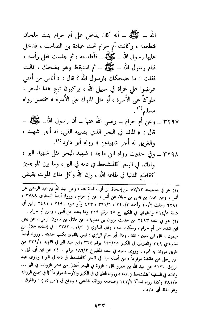 3297 - وعن أم حرام - رَضِيَ اللَّهُ عَنْهَا - أن رسول الله - صَلَّى اللَّهُ عَلَيْهِ وَسَلَّمَ - قال: «المائد في البحر الذي يصيبه القيء له أجر شهيد، والغريق له أجر شهيدين» رواه أبو داود.