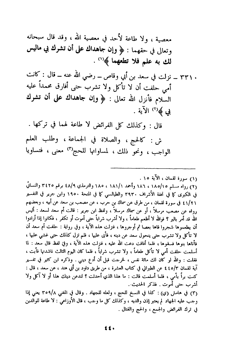 3310 - نزلت في سعد بن أبي وقاص - رَضِيَ اللَّهُ عَنْهُ - قال: كانت أمي حلفت أن لا تأكل ولا تشرب حتى أفارق محمدا - عَلَيْهِ السَّلَامُ - فأنزل الله تعالى: {وَإِنْ جَاهَدَاكَ عَلى أَنْ تُشْرِكَ بِي} [لقمان: 15] الآية.