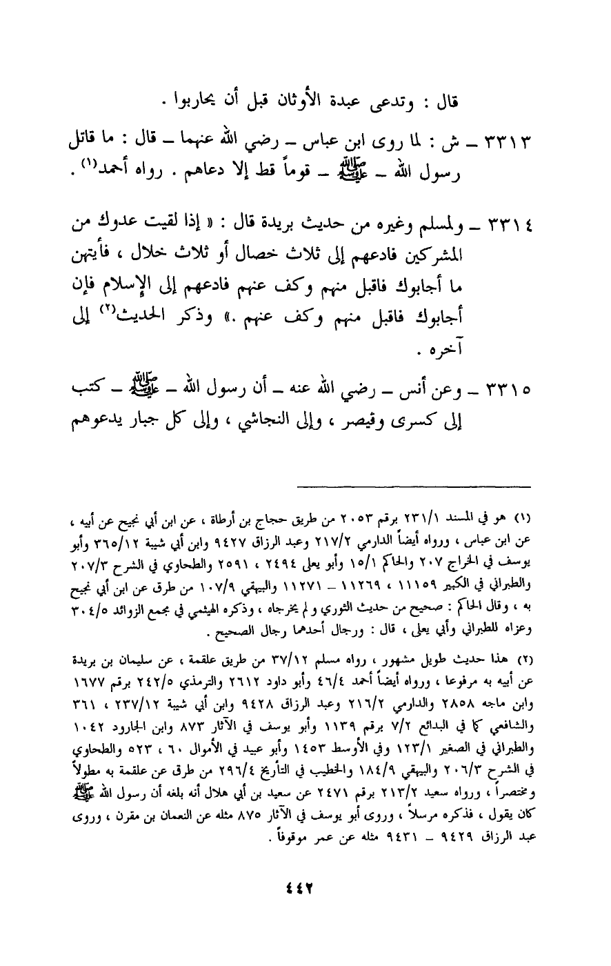 3313 - ش: لما «روى ابن عباس - رَضِيَ اللَّهُ عَنْهُمَا - قال: ما قاتل رسول الله - صَلَّى اللَّهُ عَلَيْهِ وَسَلَّمَ - قوما قط إلا دعاهم» . رواه أحمد.