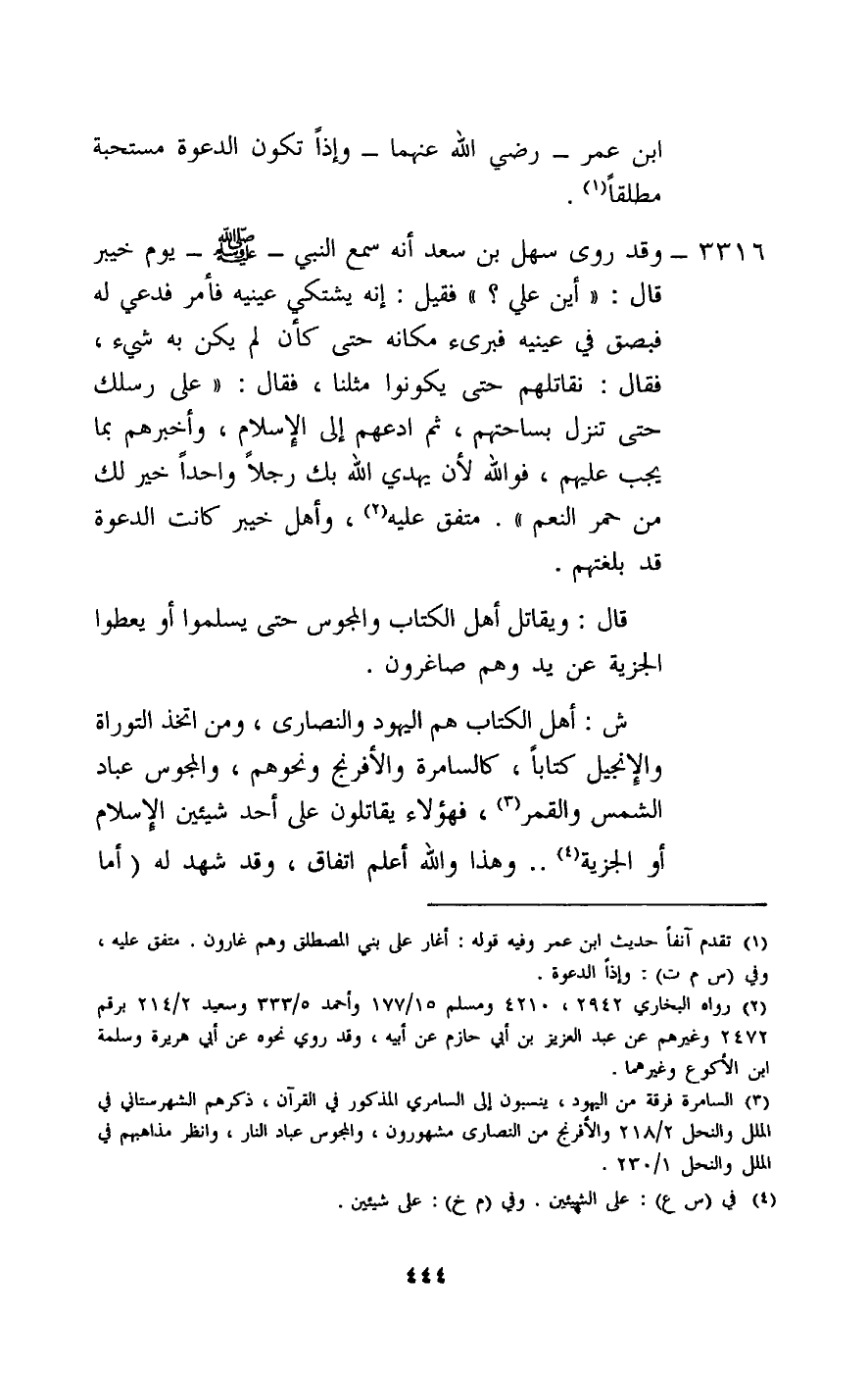 3316 - وقد «روى سهل بن سعد أنه سمع النبي - صَلَّى اللَّهُ عَلَيْهِ وَسَلَّمَ - يوم خيبر قال: «أين علي» ؟ فقيل: إنه يشتكي عينيه فأمر فدعي له فبصق في عينيه فبرئ مكانه حتى كأن لم يكن به شيء، فقال: نقاتلهم حتى يكونوا مثلنا، فقال: «على رسلك حتى تنزل بساحتهم، ثم ادعهم إلى الإسلام، وأخبرهم بما يجب عليهم، فوالله لأن يهدي الله بك رجلا واحدا خير لك من حمر النعم» متفق عليه، وأهل خيبر كانت الدعوة قد بلغتهم.