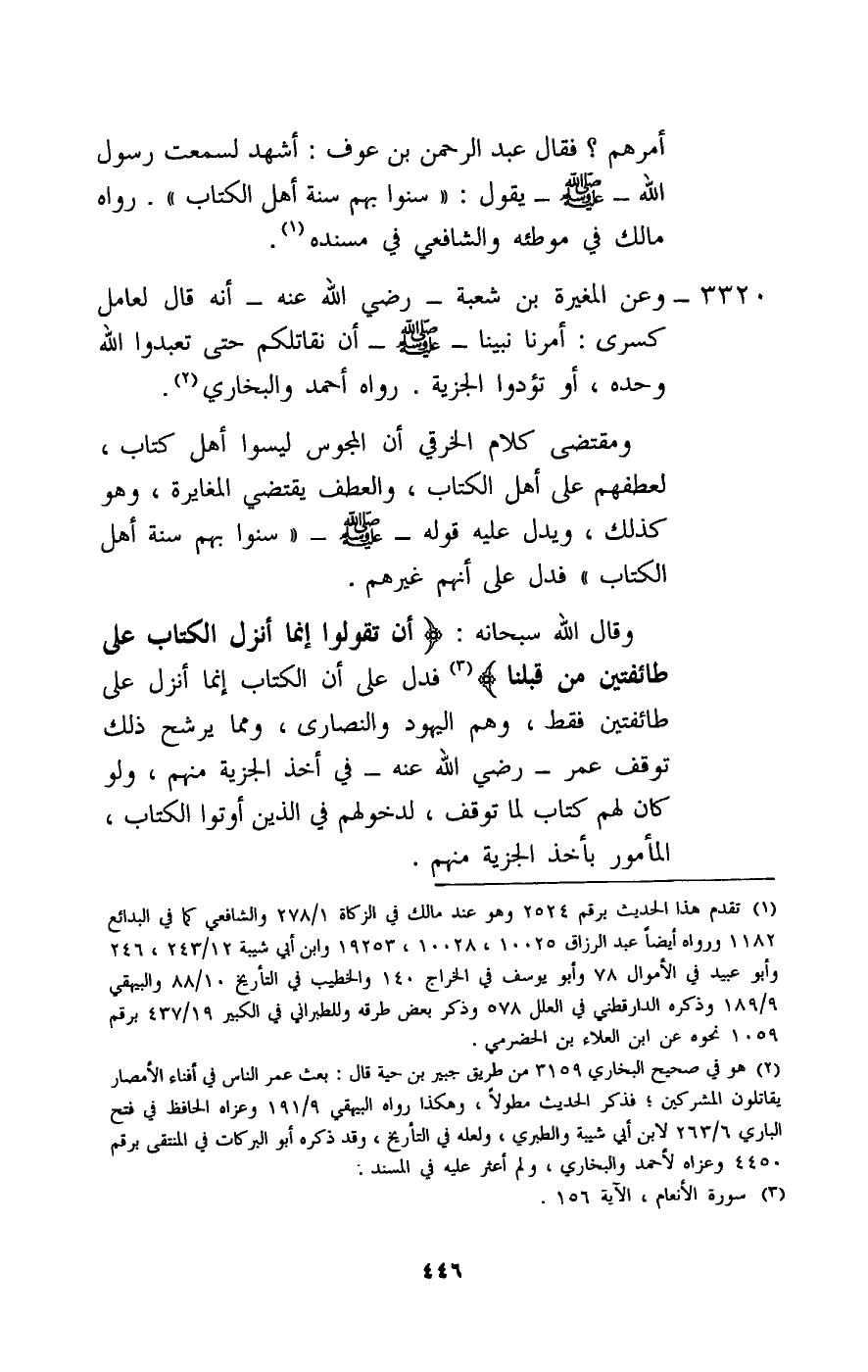3320 - «وعن المغيرة بن شعبة - رَضِيَ اللَّهُ عَنْهُ - أنه قال لعامل كسرى: أمرنا نبينا - صَلَّى اللَّهُ عَلَيْهِ وَسَلَّمَ - أن نقاتلكم حتى تعبدوا الله وحده، أو تؤدوا الجزية» ، رواه أحمد والبخاري. ومقتضى كلام الخرقي أن المجوس ليسوا أهل كتاب، لعطفهم على أهل الكتاب، والعطف يقتضي المغايرة، وهو كذلك، ويدل عليه قوله: - صَلَّى اللَّهُ عَلَيْهِ وَسَلَّمَ - «سنوا بهم سنة أهل الكتاب» فدل على أنهم غيرهم. وقال الله سبحانه: {أَنْ تَقُولُوا إِنَّمَا أُنْزِلَ الْكِتَابُ عَلَى طَائِفَتَيْنِ مِنْ قَبْلِنَا} [الأنعام: 156] فدل على أن الكتاب إنما أنزل على طائفتين فقط، وهم اليهود والنصارى، ومما يرشح ذلك توقف عمر - رَضِيَ اللَّهُ عَنْهُ - في أخذ الجزية منهم، ولو كان لهم كتاب لما توقف، لدخولهم في الذين أوتوا الكتاب، المأمور بأخذ الجزية منهم.