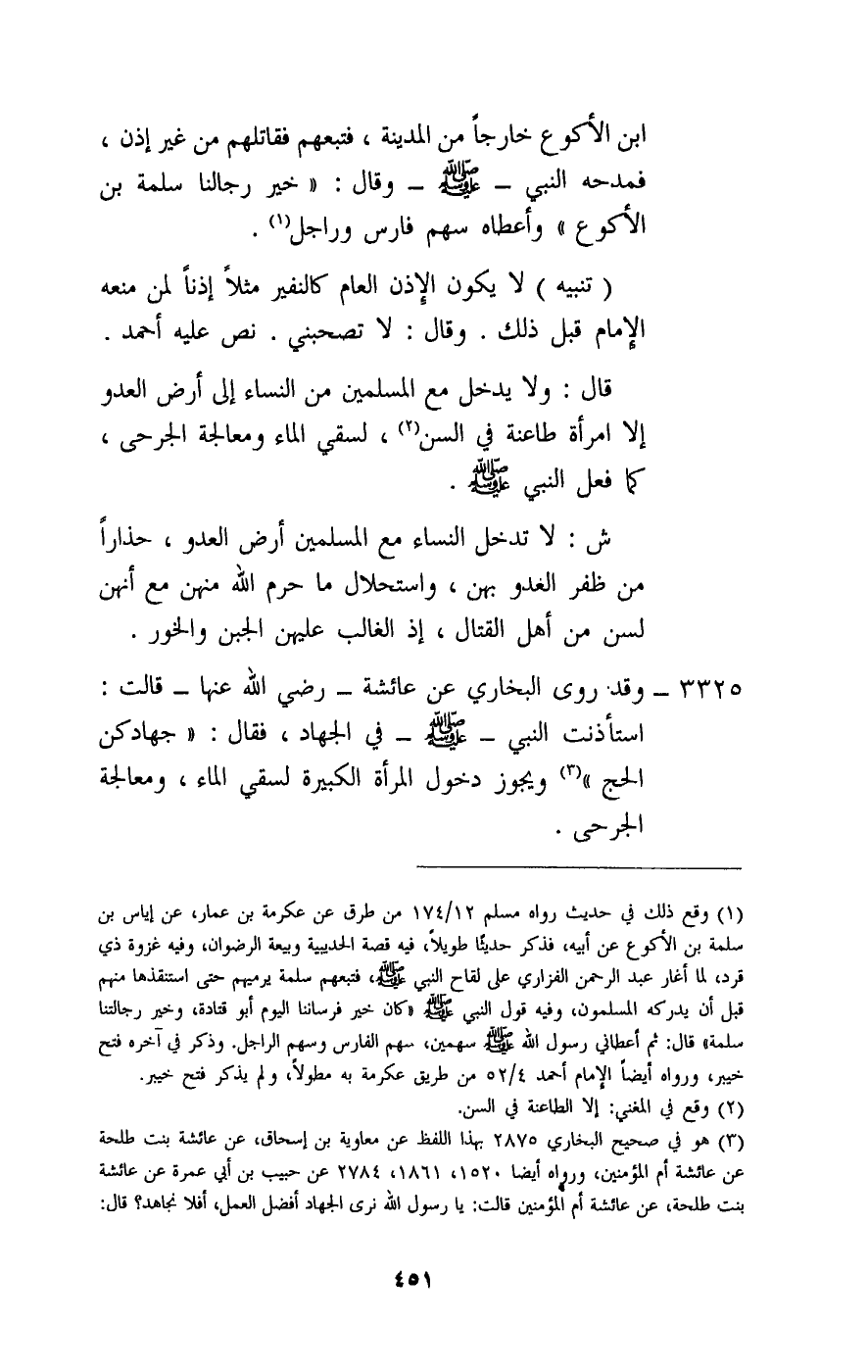 3325 - وقد روى البخاري «عن عائشة - رَضِيَ اللَّهُ عَنْهَا - قالت: استأذنت النبي - صَلَّى اللَّهُ عَلَيْهِ وَسَلَّمَ - في الجهاد، فقال: «جهادكن الحج» ويجوز دخول المرأة الكبيرة لسقي الماء، ومعالجة الجرحى.