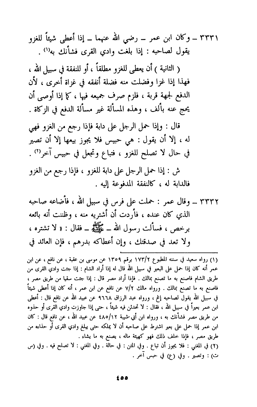 3331 - وكان ابن عمر - رَضِيَ اللَّهُ عَنْهُمَا - إذا أعطى شيئا للغزو يقول لصاحبه: إذا بلغت وادي القرى فشأنك به. (الثانية) أن يعطى للغزو مطلقا، أو للنفقة في سبيل الله، فهذا إذا غزا وفضلت منه فضلة أنفقه في غزاة أخرى، لأن الدفع لجهة قربة، فلزم صرف جميعه فيها، كما إذا أوصى أن يحج عنه بألف، وهذه المسألة غير مسألة الدفع في الزكاة.