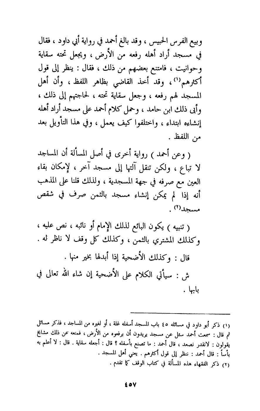 وبيع الفرس الحبيس، وقد بالغ أحمد في رواية أبي داود، فقال في مسجد أراد أهله رفعه من الأرض، ويجعل تحته سقاية وحوانيت، فامتنع بعضهم من ذلك، فقال: ينظر إلى قول أكثرهم، وقد أخذ القاضي بظاهر اللفظ، وأن أهل المسجد لهم رفعه، وجعل سقاية تحته، لحاجتهم إلى ذلك، وأبى ذلك ابن حامد، وحمل كلام أحمد على مسجد أراد أهله إنشاءه ابتداء، واختلفوا كيف يعمل، وفي هذا التأويل بعد من اللفظ. (وعن أحمد) رواية أخرى في أصل المسألة أن المساجد لا تباع، ولكن تنقل آلتها إلى مسجد آخر، لإمكان بقاء العين مع صرفه في جهة المسجدية، ولذلك قلنا على المذهب أنه إذا لم يمكن إنشاء مسجد بالثمن صرف في شقص مسجد. (تنبيه) يكون البائع لذلك الإمام أو نائبه، نص عليه، وكذلك المشتري بالثمن، وكذلك كل وقف لا ناظر له.