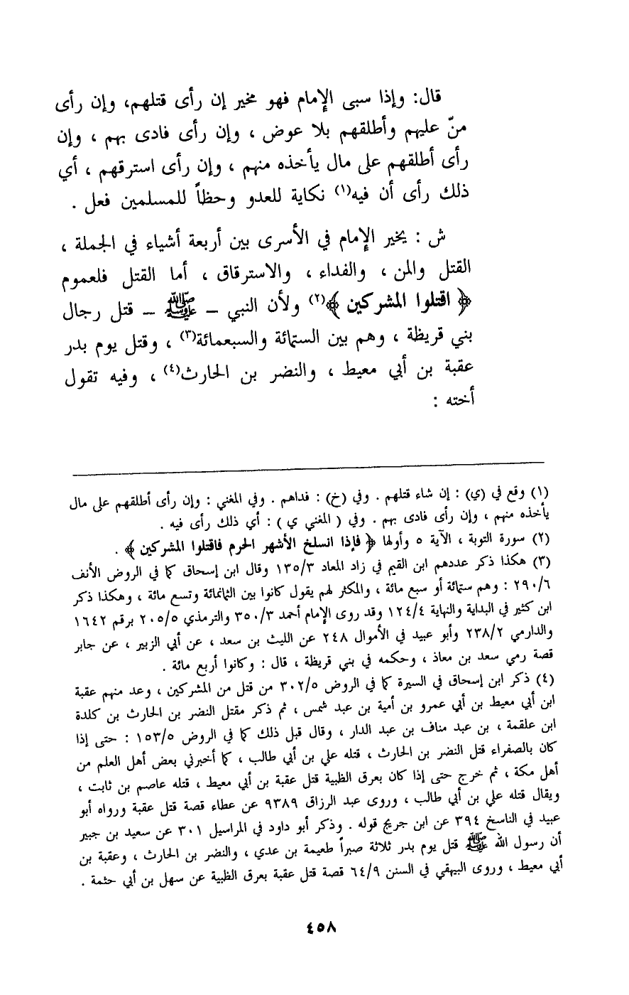 ش: يخير الإمام في الأسرى بين أربعة أشياء في الجملة، القتل، والمن، والفداء، والاسترقاق، أما القتل فلعموم: {فَاقْتُلُوا الْمُشْرِكِينَ} [التوبة: 5] ولأن النبي - صَلَّى اللَّهُ عَلَيْهِ وَسَلَّمَ - قتل رجال بني قريظة، وهم بين الستمائة والسبعمائة، وقتل يوم بدر عقبة بن أبي معيط، والنضر بن الحارث، وفيه تقول أخته: