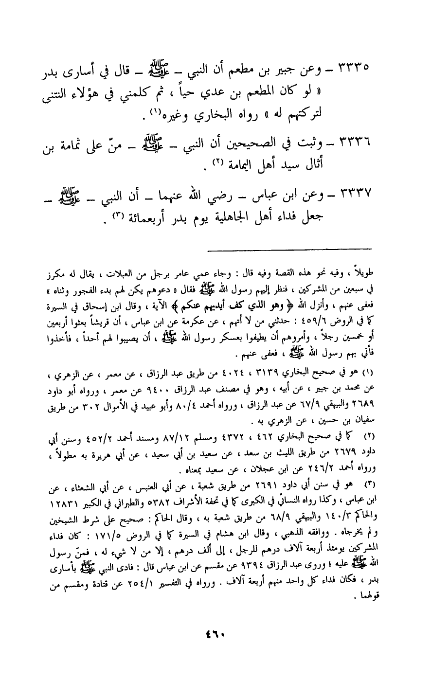 3337 - وعن ابن عباس - رَضِيَ اللَّهُ عَنْهُمَا - «أن النبي - صَلَّى اللَّهُ عَلَيْهِ وَسَلَّمَ - جعل فداء أهل الجاهلية يوم بدر أربعمائة.»