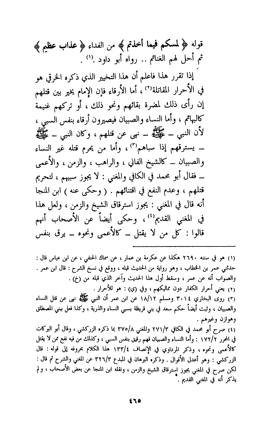 قوله: {لَمَسَّكُمْ فِيمَا أَخَذْتُمْ} [الأنفال: 68] من الفداء عذاب عظيم ثم أحل لهم الغنائم» . . . رواه أبو داود. إذا تقرر هذا، فاعلم أن هذا التخيير الذي ذكره الخرقي هو في الأحرار المقاتلة، أما الأرقاء فإن الإمام يخير بين قتلهم إن رأى ذلك لمضرة بقائهم ونحو ذلك، أو تركهم غنيمة كالبهائم، وأما النساء والصبيان فيصيرون أرقاء بنفس السبي، لأن النبي - صَلَّى اللَّهُ عَلَيْهِ وَسَلَّمَ - نهى عن قتلهم، وكان النبي - صَلَّى اللَّهُ عَلَيْهِ وَسَلَّمَ - يسترقهم إذا سباهم، وأما من يحرم قتله غير النساء والصبيان - كالشيخ الفاني، والراهب، والزمن، والأعمى - فقال أبو محمد في الكافي والمغني: لا يجوز سبيهم لتحريم قتلهم، وعدم النفع في اقتنائهم. (وحكى عنه) ابن المنجا أنه قال في المغني: يجوز استرقاق الشيخ والزمن، ولعل هذا في المغني القديم، وحكى أيضا عن الأصحاب أنهم قالوا: كل من لا يقتل - كالأعمى ونحوه - يرق بنفس