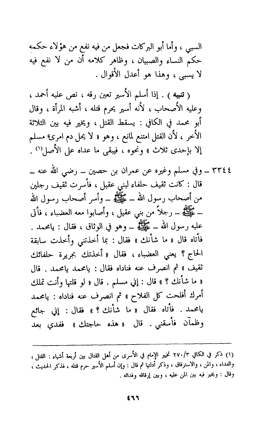 3344 - وفي مسلم وغيره «عن عمران بن حصين - رَضِيَ اللَّهُ عَنْهُ - قال: كانت ثقيف حلفاء لبني عقيل، فأسرت ثقيف رجلين من أصحاب رسول الله - صَلَّى اللَّهُ عَلَيْهِ وَسَلَّمَ - وأسر أصحاب رسول الله - صَلَّى اللَّهُ عَلَيْهِ وَسَلَّمَ - رجلا من بني عقيل، وأصابوا معه العضباء، فأتى عليه رسول الله - صَلَّى اللَّهُ عَلَيْهِ وَسَلَّمَ - وهو في الوثاق، فقال: يا محمد، فأتاه قال: «ما شأنك» فقال: بما أخذتني وأخذت سابقة الحاج؟ يعني العضباء، فقال: «أخذتك بجريرة حلفائك ثقيف» ثم انصرف عنه فناداه فقال: يا محمد يا محمد، قال: «ما شأنك» ؟ قال: إني مسلم. قال: «لو قلتها وأنت تملك أمرك أفلحت كل الفلاح» ثم انصرف عنه فناداه: يا محمد يا محمد، فأتاه فقال؛ «ما شأنك» ؟ فقال: إني جائع وظمآن فأسقني. قال: «هذه حاجتك» ففدي بعد