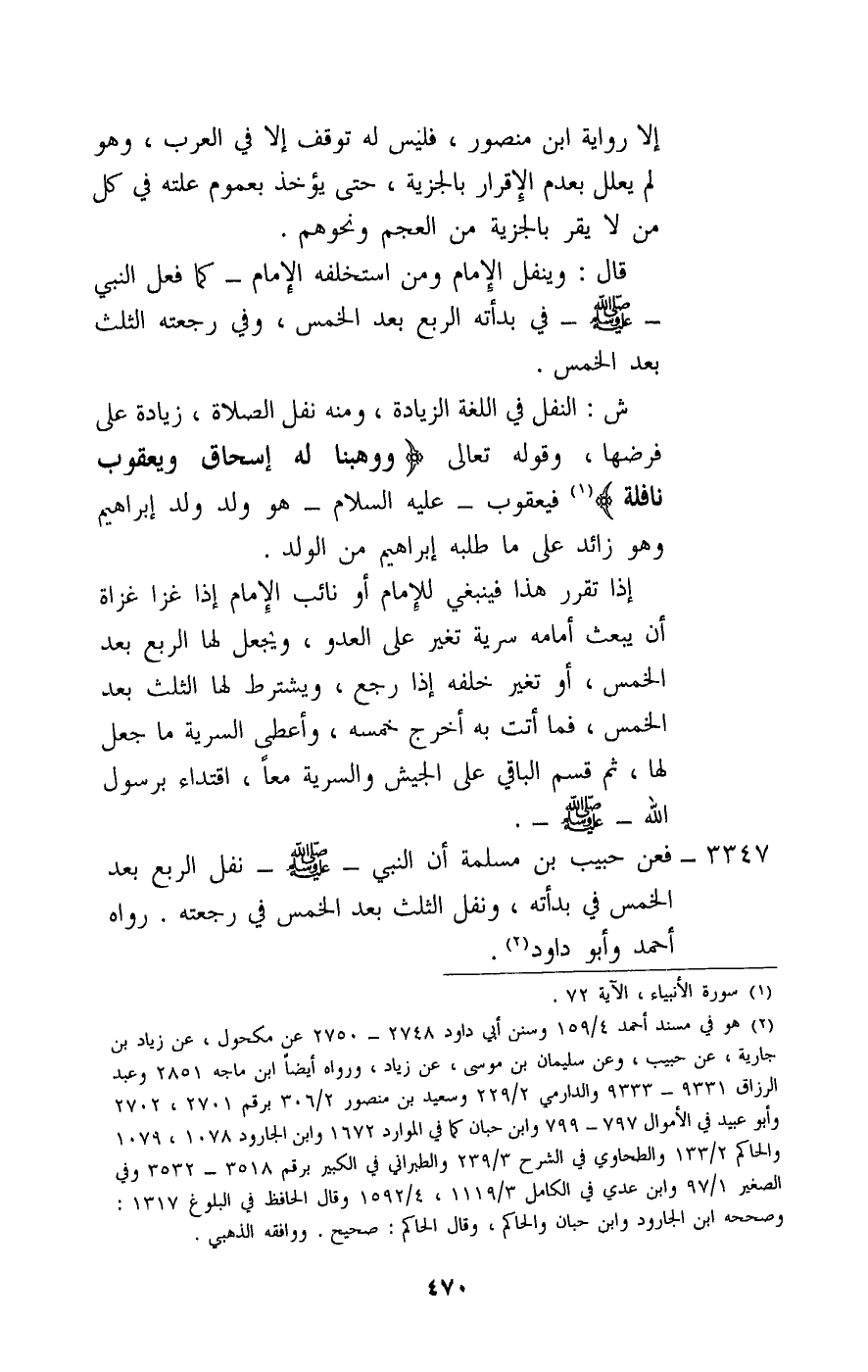 3347 - فعن حبيب بن مسلمة «أن النبي - صَلَّى اللَّهُ عَلَيْهِ وَسَلَّمَ - نفل الربع بعد الخمس في بدأته، ونفل الثلث بعد الخمس في رجعته» ، رواه أحمد وأبو داود.