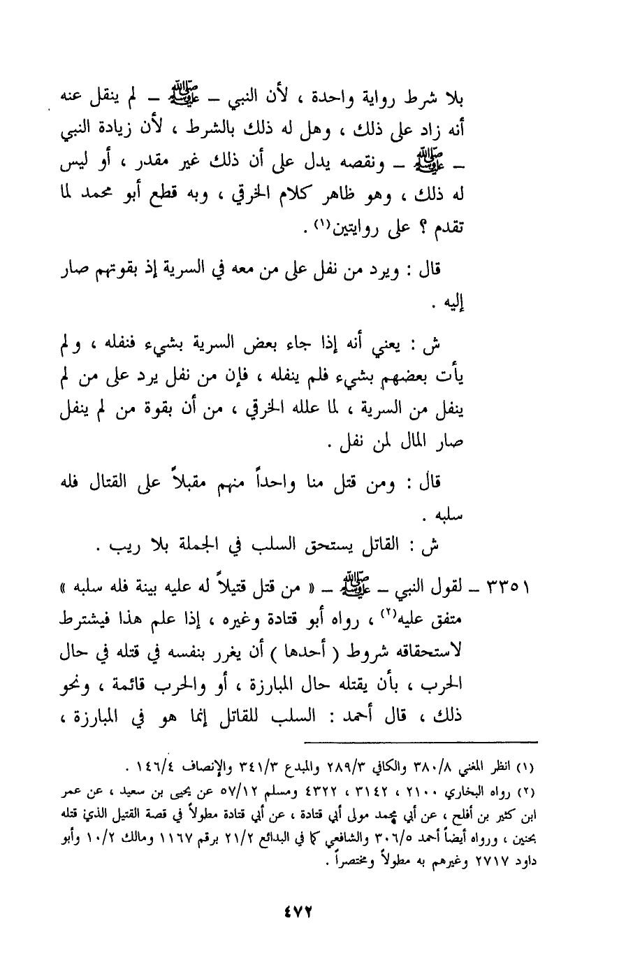 3351 - لقول النبي - صَلَّى اللَّهُ عَلَيْهِ وَسَلَّمَ -: «من قتل قتيلا له عليه بينة فله سلبه» متفق عليه، رواه أبو قتادة وغيره، إذا علم هذا فيشترط لاستحقاقه شروط (أحدها) أن يغرر بنفسه في قتله في حال الحرب، بأن يقتله حال المبارزة، أو والحرب قائمة، ونحو ذلك، قال أحمد: السلب للقاتل إنما هو في المبارزة،