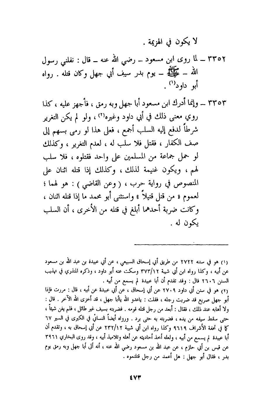 3352 - لما «روى ابن مسعود - رَضِيَ اللَّهُ عَنْهُ - قال: نفلني رسول الله - صَلَّى اللَّهُ عَلَيْهِ وَسَلَّمَ - يوم بدر سيف أبي جهل وكان قتله» . رواه أبو داود.