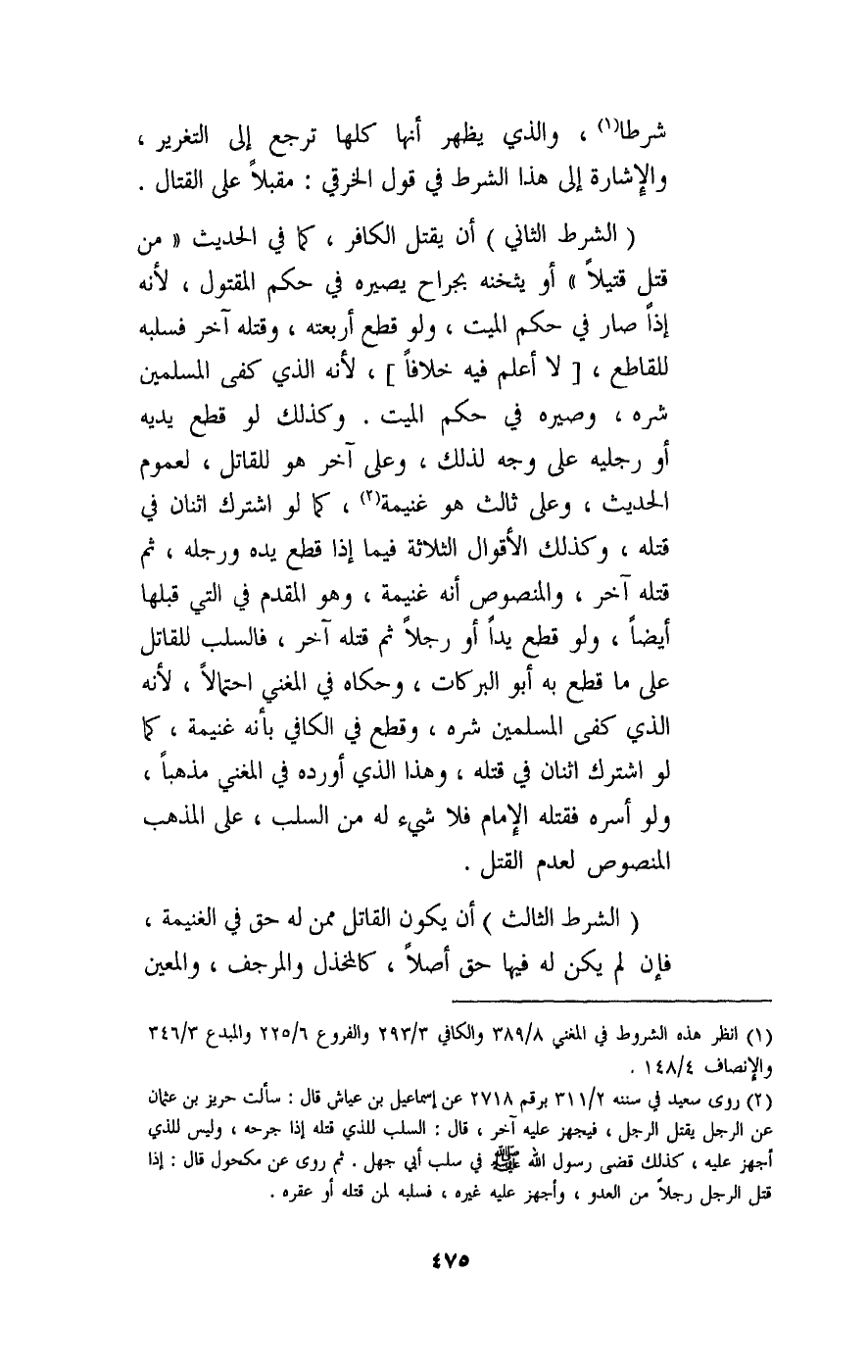 شرطا، والذي يظهر أنها كلها ترجع إلى التغرير، والإشارة إلى هذا الشرط في قول الخرقي: مقبلا على القتال. (الشرط الثاني) أن يقتل الكافر، كما في الحديث «من قتل قتيلا» أو يثخنه بجراح يصيره في حكم المقتول، لأنه إذا صار في حكم الميت، ولو قطع أربعته، وقتله آخر فسلبه للقاطع، [لا أعلم فيه خلافا] ، لأنه الذي كفى المسلمين شره، وصيره في حكم الميت. وكذلك لو قطع يديه أو رجليه على وجه لذلك، وعلى آخر هو للقاتل، لعموم الحديث، وعلى ثالث هو غنيمة، كما لو اشترك اثنان في قتله، وكذلك الأقوال الثلاثة فيما إذا قطع يده ورجله، ثم قتله آخر، والمنصوص أنه غنيمة، وهو المقدم في التي قبلها أيضا، ولو قطع يدا أو رجلا ثم قتله آخر، فالسلب للقاتل على ما قطع به أبو البركات، وحكاه في المغني احتمالا، لأنه الذي كفى المسلمين شره، وقطع في الكافي بأنه غنيمة، كما لو اشترك اثنان في قتله، وهذا الذي أورده في المغني مذهبا، ولو أسره فقتله الإمام فلا شيء له من السلب، على المذهب المنصوص لعدم القتل. (الشرط الثالث) أن يكون القاتل ممن له حق في الغنيمة، فإن لم يكن له فيها حق أصلا، كالمخذل والمرجف، والمعين