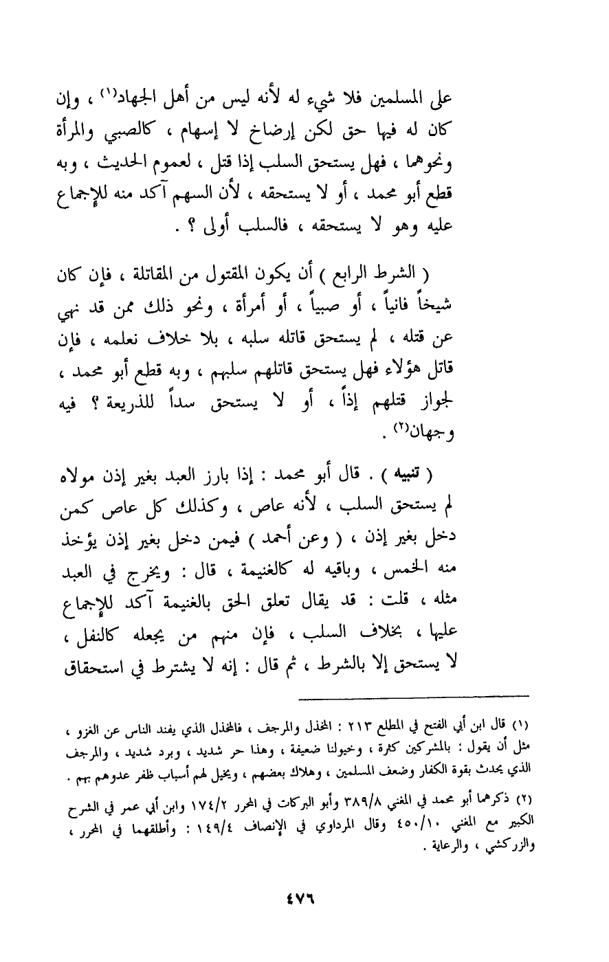 على المسلمين فلا شيء له لأنه ليس من أهل الجهاد، وإن كان له فيها حق لكن إرضاخ لا إسهام، كالصبي والمرأة ونحوهما، فهل يستحق السلب إذا قتل، لعموم الحديث، وبه قطع أبو محمد، أو لا يستحقه، لأن السهم آكد منه للإجماع عليه وهو لا يستحقه، فالسلب أولى؟ (الشرط الرابع) أن يكون المقتول من المقاتلة، فإن كان شيخا فانيا، أو صبيا، أو امرأة، ونحو ذلك ممن قد نهي عن قتله، لم يستحق قاتله سلبه، بلا خلاف نعلمه، فإن قاتل هؤلاء فهل يستحق قاتلهم سلبهم، وبه قطع أبو محمد، لجواز قتلهم إذا، أو لا يستحق سدا للذريعة؟ فيه وجهان.