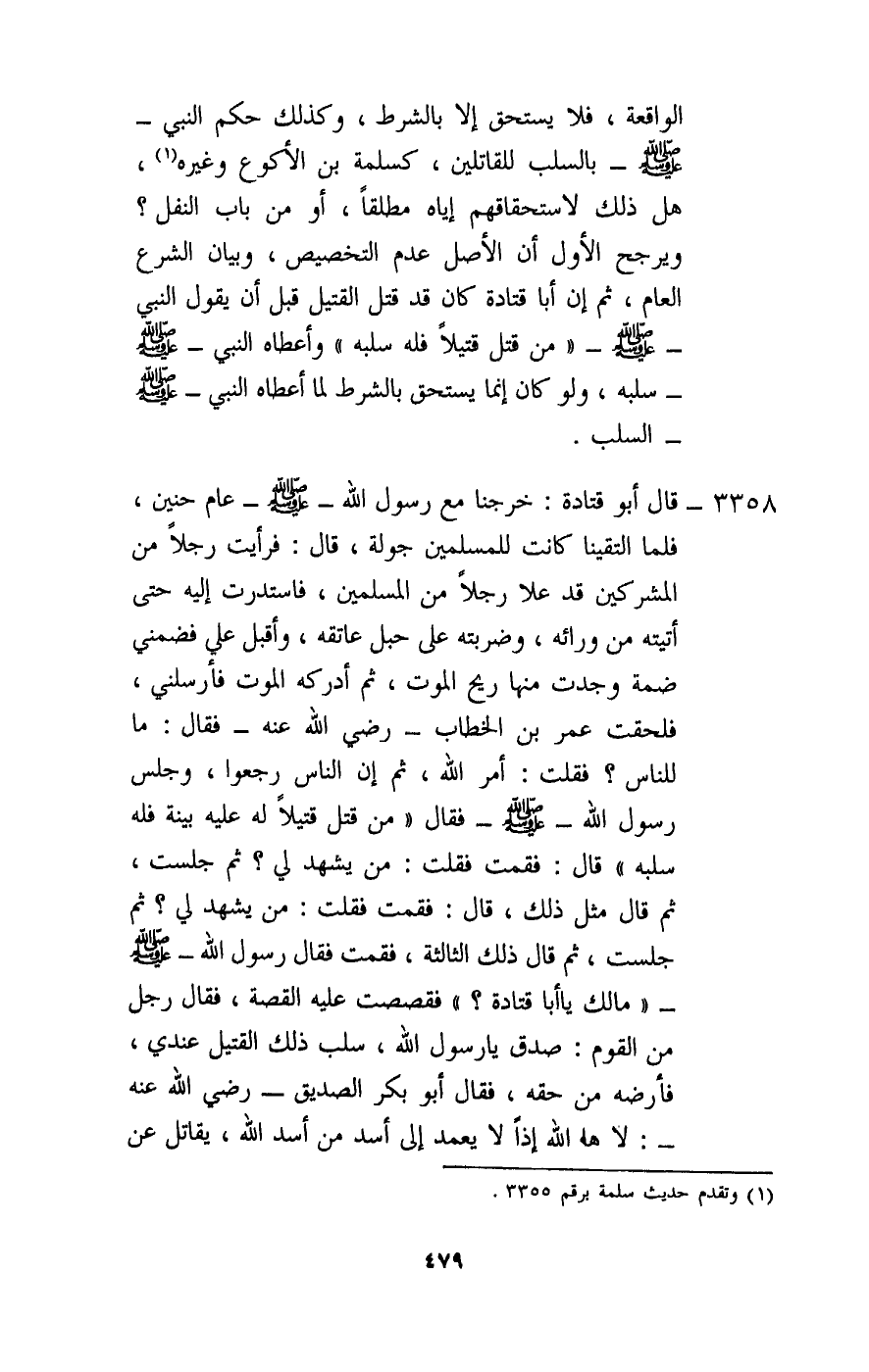 3358 - «قال أبو قتادة: خرجنا مع رسول الله - صَلَّى اللَّهُ عَلَيْهِ وَسَلَّمَ - عام حنين، فلما التقينا كانت للمسلمين جولة، قال: فرأيت رجلا من المشركين قد علا رجلا من المسلمين، فاستدرت إليه حتى أتيته من ورائه، وضربته على حبل عاتقه، وأقبل علي فضمني ضمة وجدت منها ريح الموت، ثم أدركه الموت فأرسلني، فلحقت عمر بن الخطاب - رَضِيَ اللَّهُ عَنْهُ - فقال: ما للناس؟ فقلت: أمر الله، ثم إن الناس رجعوا، وجلس رسول الله - صَلَّى اللَّهُ عَلَيْهِ وَسَلَّمَ - فقال: «من قتل قتيلا له عليه بينة فله سلبه» قال: فقمت فقلت: من يشهد لي؟ ثم جلست، ثم قال مثل ذلك، قال: فقمت فقلت: من يشهد لي؟ ثم جلست، ثم قال ذلك الثالثة، فقمت فقال رسول الله - صَلَّى اللَّهُ عَلَيْهِ وَسَلَّمَ -: «ما لك يا أبا قتادة» ؟ فقصصت عليه القصة، فقال رجل من القوم: صدق يا رسول الله، سلب ذلك القتيل عندي، فأرضه من حقه، فقال أبو بكر الصديق - رَضِيَ اللَّهُ عَنْهُ -: لا ها الله إذا لا يعمد إلى أسد من أسد الله، يقاتل عن