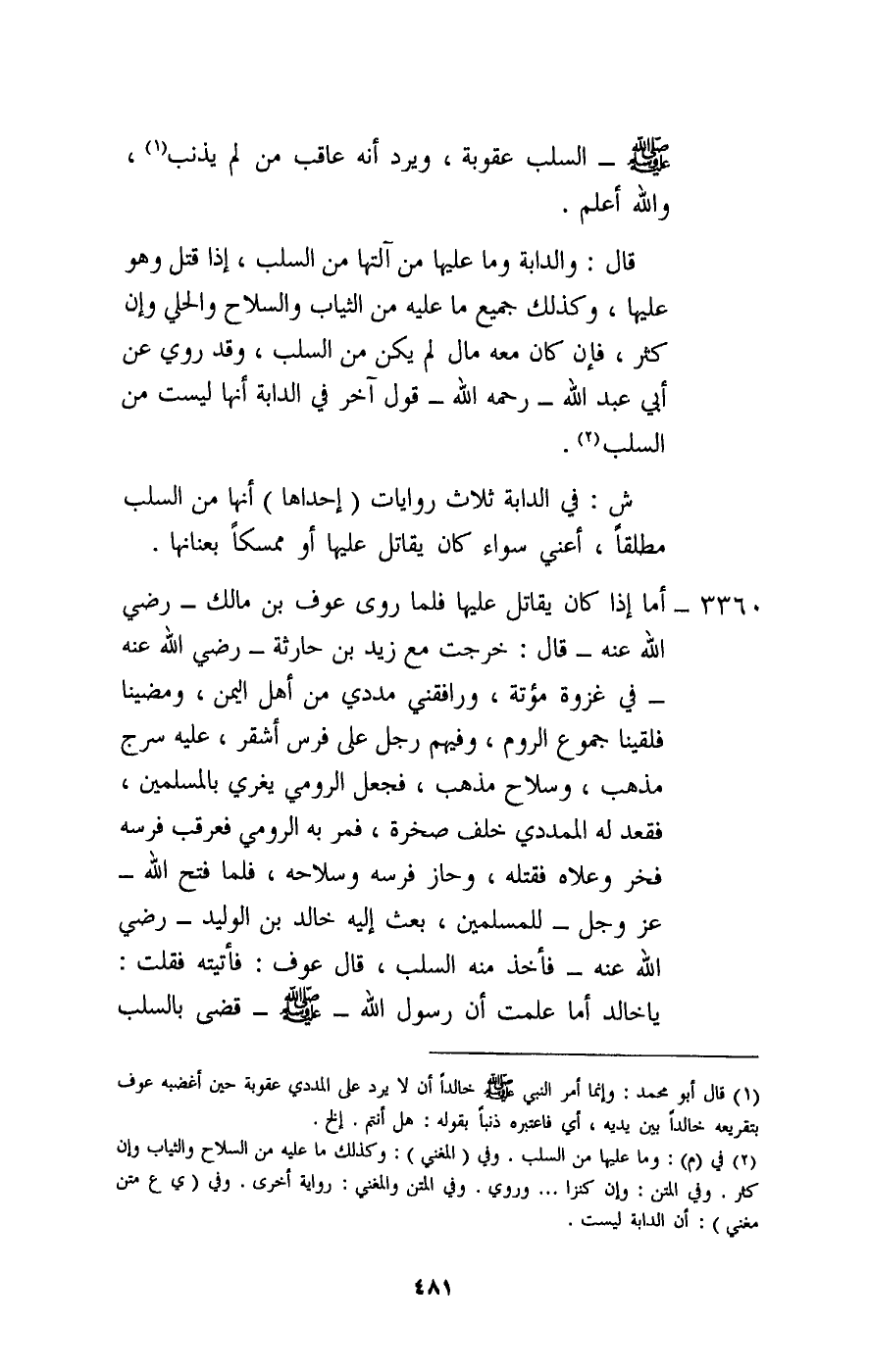 3360 - أما إذا كان يقاتل عليها فلما «روى عوف بن مالك - رَضِيَ اللَّهُ عَنْهُ - قال: خرجت مع زيد بن حارثة - رَضِيَ اللَّهُ عَنْهُ - في غزوة مؤتة، ورافقني مددي من أهل اليمن، ومضينا فلقينا جموع الروم، وفيهم رجل على فرس أشقر، عليه سرج مذهب، وسلاح مذهب، فجعل الرومي يغري بالمسلمين، فقعد له المددي خلف صخرة، فمر به الرومي فعرقب فرسه فخر وعلاه فقتله، وحاز فرسه وسلاحه، فلما فتح الله عز وجل للمسلمين، بعث إليه خالد بن الوليد - رَضِيَ اللَّهُ عَنْهُ - فأخذ منه السلب، قال عوف: فأتيته فقلت: يا خالد أما علمت أن رسول الله - صَلَّى اللَّهُ عَلَيْهِ وَسَلَّمَ - قضى بالسلب
