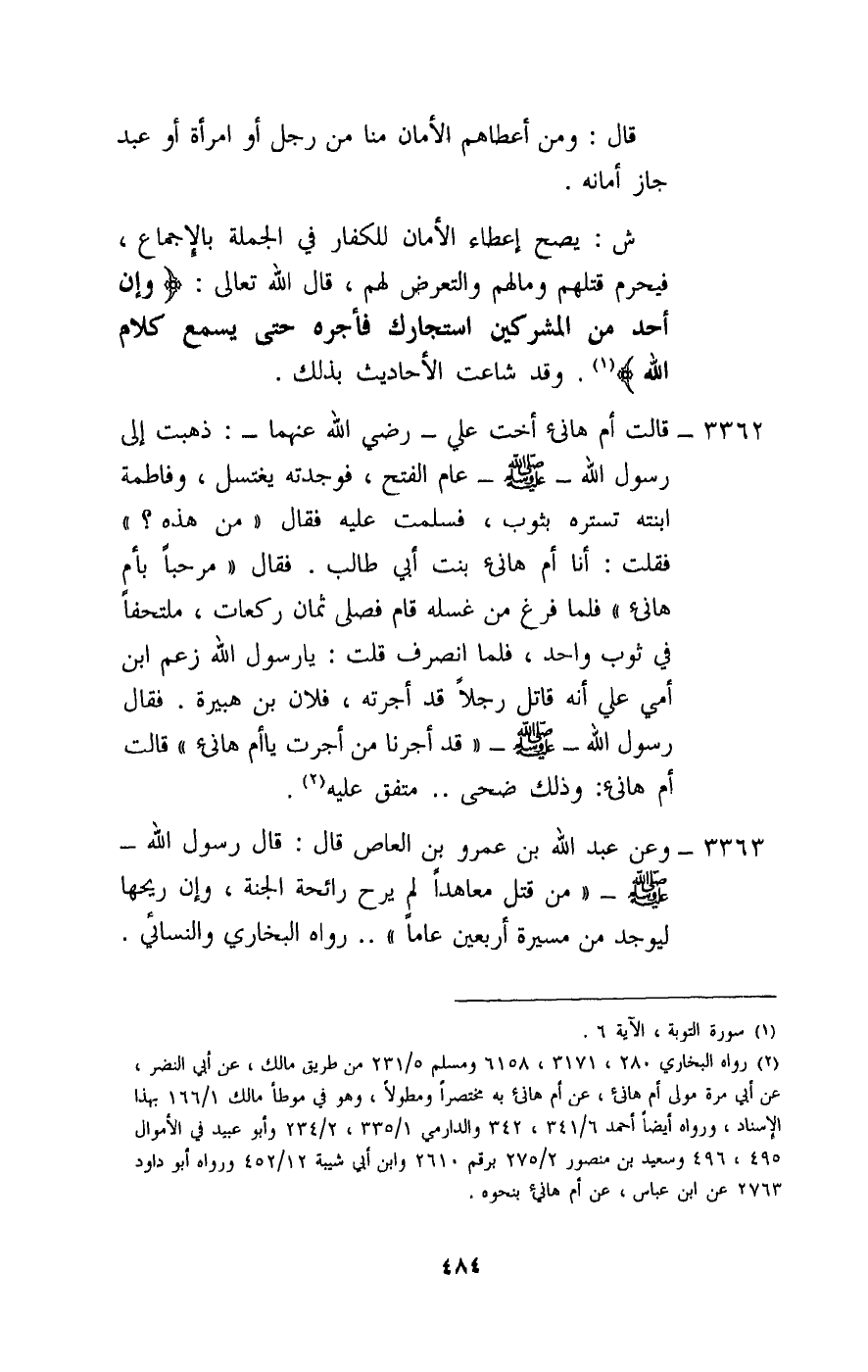 3362 - «قالت أم هانئ أخت علي - رَضِيَ اللَّهُ عَنْهُمَا -: ذهبت إلى رسول الله - صَلَّى اللَّهُ عَلَيْهِ وَسَلَّمَ - عام الفتح، فوجدته يغتسل، وفاطمة ابنته تستره بثوب، فسلمت عليه فقال: «من هذه» ؟ فقلت: أنا أم هانئ بنت أبي طالب، فقال: «مرحبا بأم هانئ» ، فلما فرغ من غسله قام فصلى ثمان ركعات، ملتحفا في ثوب واحد، فلما انصرف قلت: يا رسول الله زعم ابن أمي علي أنه قاتل رجلا قد أجرته، فلان بن هبيرة، فقال رسول الله - صَلَّى اللَّهُ عَلَيْهِ وَسَلَّمَ -: «قد أجرنا من أجرت يا أم هانئ» قالت أم هانئ: وذلك ضحى» . . . متفق عليه.
