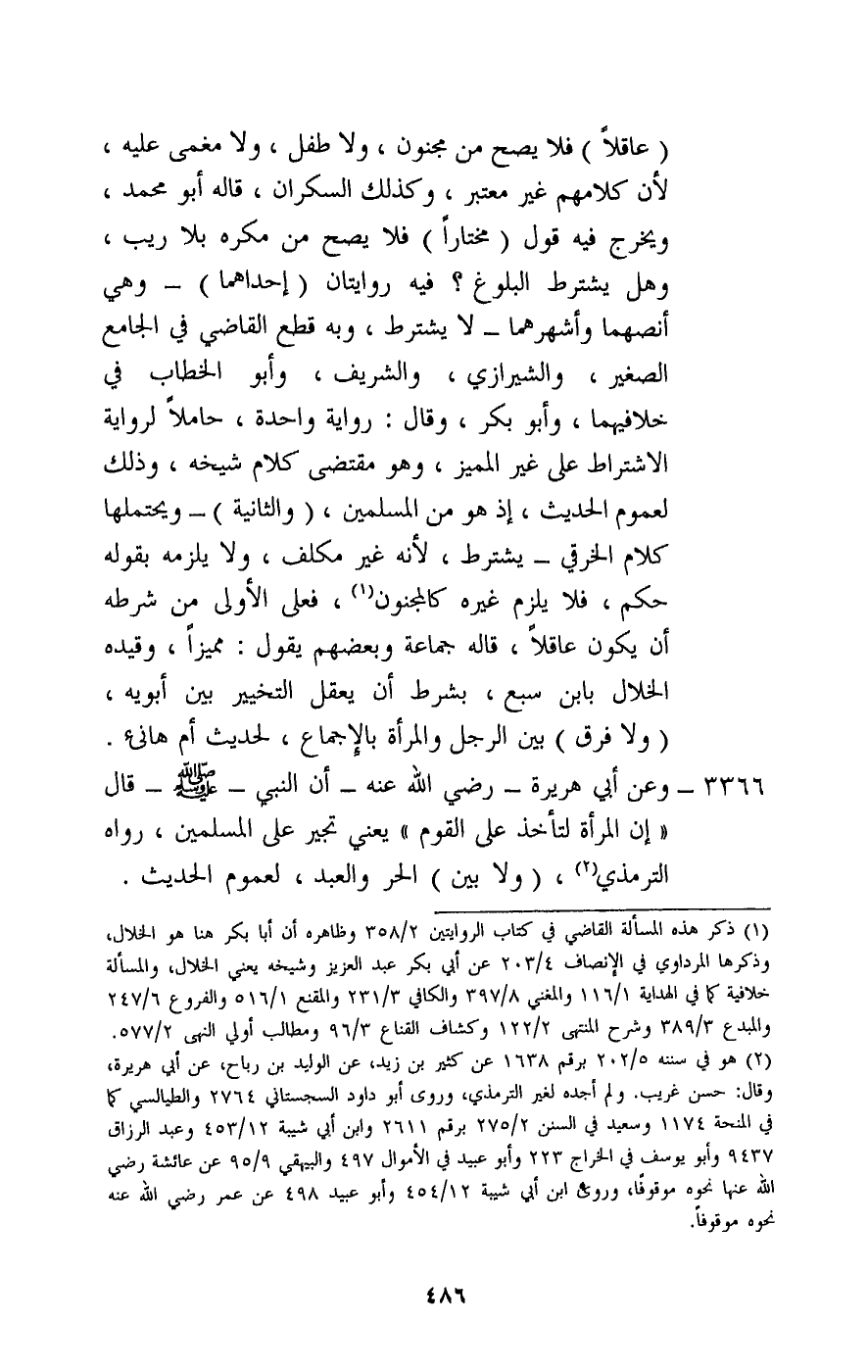 (عاقلا) فلا يصح من مجنون، ولا طفل، ولا مغمى عليه، لأن كلامهم غير معتبر، وكذلك السكران، قاله أبو محمد، ويخرج فيه قول (مختارا) فلا يصح من مكره بلا ريب، وهل يشترط البلوغ؟ فيه روايتان (إحداهما) - وهي أنصهما وأشهرهما - لا يشترط، وبه قطع القاضي في الجامع الصغير، والشيرازي، والشريف، وأبو الخطاب في خلافيهما، وأبو بكر، وقال: رواية واحدة، حاملا لرواية الاشتراط على غير المميز، وهو مقتضى كلام شيخه، وذلك لعموم الحديث، إذ هو من المسلمين. (والثانية) - ويحتملها كلام الخرقي - يشترط، لأنه غير مكلف، ولا يلزمه بقوله حكم، فلا يلزم غيره كالمجنون، فعلى الأولى من شرطه أن يكون عاقلا، قاله جماعة وبعضهم يقول: مميزا، وقيده الخلال بابن سبع، بشرط أن يعقل التخيير بين أبويه، (ولا فرق) بين الرجل والمرأة بالإجماع، لحديث أم هانئ.