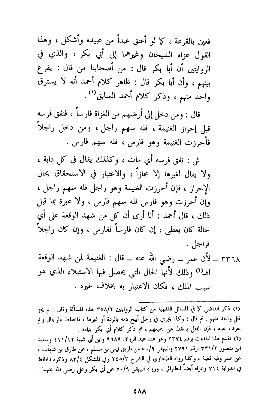 ش: نفق فرسه أي مات، وكذلك يقال في كل دابة، ولا يقال لغيرها إلا مجازا، والاعتبار في الاستحقاق بحال الإحراز، فإن أحرزت الغنيمة وهو راجل فله سهم راجل، وإن أحرزت وهو فارس فله سهم فارس، ولا عبرة بما قبل ذلك، قال أحمد: أنا أرى أن كل من شهد الوقعة على أي حالة كان يعطى، إن كان فارسا ففارس، وإن كان راجلا فراجل.