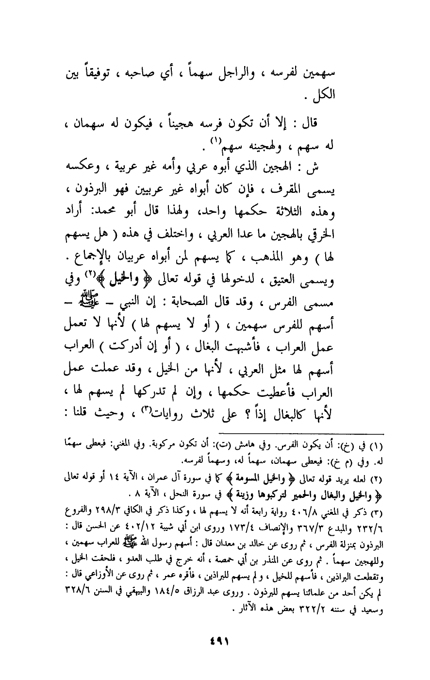 ش: الهجين الذي أبوه عربي وأمه غير عربية، وعكسه يسمى المقرف، فإن كان أبواه غير عربيين فهو البرذون، وهذه الثلاثة حكمها واحد، ولهذا قال أبو محمد: أراد الخرقي بالهجين ما عدا العربي، واختلف في هذه (هل يسهم لها) وهو المذهب، كما يسهم لمن أبواه عربيان بالإجماع. ويسمى العتيق، لدخولها في قَوْله تَعَالَى: والخيل وفي مسمى الفرس، وقد قال الصحابة: إن النبي - صَلَّى اللَّهُ عَلَيْهِ وَسَلَّمَ - أسهم للفرس سهمين، (أو لا يسهم لها) لأنها لا تعمل عمل العراب، فأشبهت البغال، (أو إن أدركت) العراب أسهم لها مثل العربي، لأنها من الخيل، وقد عملت عمل العراب فأعطيت حكمها، وإن لم تدركها لم يسهم لها، لأنها كالبغال إذا؟ على ثلاث روايات، وحيث قلنا: