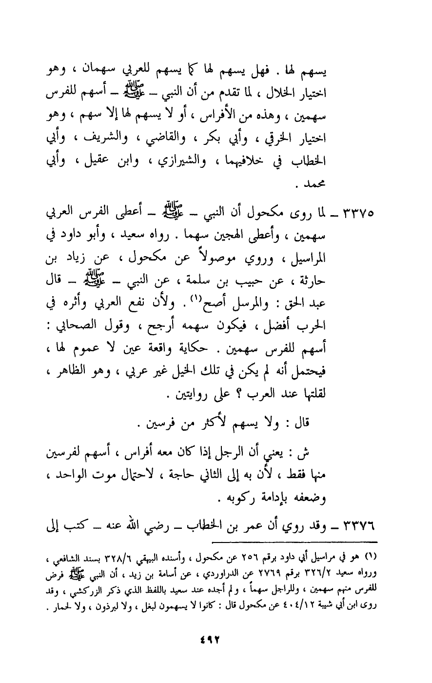 3375 - لما «روى مكحول أن النبي - صَلَّى اللَّهُ عَلَيْهِ وَسَلَّمَ - أعطى الفرس العربي سهمين، وأعطى الهجين سهما» ، رواه سعيد، وأبو داود في المراسيل، وروي موصولا عن مكحول، عن زياد بن حارثة، عن حبيب بن سلمة، عن النبي - صَلَّى اللَّهُ عَلَيْهِ وَسَلَّمَ - قال عبد الحق: والمرسل أصح. ولأن نفع العربي وأثره في الحرب أفضل، فيكون سهمه أرجح، وقول الصحابي: أسهم للفرس سهمين. حكاية واقعة عين لا عموم لها، فيحتمل أنه لم يكن في تلك الخيل غير عربي، وهو الظاهر، لقلتها عند العرب؟ على روايتين.