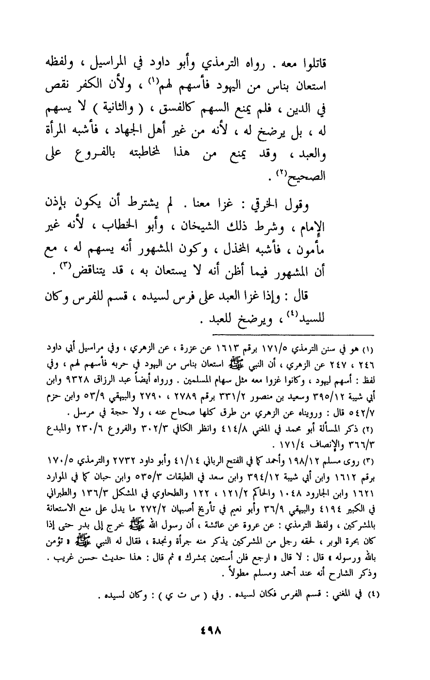 قاتلوا معه.» رواه الترمذي وأبو داود في المراسيل، ولفظه: استعان بناس من اليهود فأسهم لهم، ولأن الكفر نقص في الدين، فلم يمنع السهم كالفسق، (والثانية) لا يسهم له، بل يرضخ له، لأنه من غير أهل الجهاد، فأشبه المرأة والعبد، وقد يمنع من هذا لمخاطبته بالفروع على الصحيح. وقول الخرقي: غزا معنا. لم يشترط أن يكون بإذن الإمام، وشرط ذلك الشيخان، وأبو الخطاب، لأنه غير مأمون، فأشبه المخذل، وكون المشهور أنه يسهم له، مع أن المشهور فيما أظن أنه لا يستعان به، قد يتناقض.