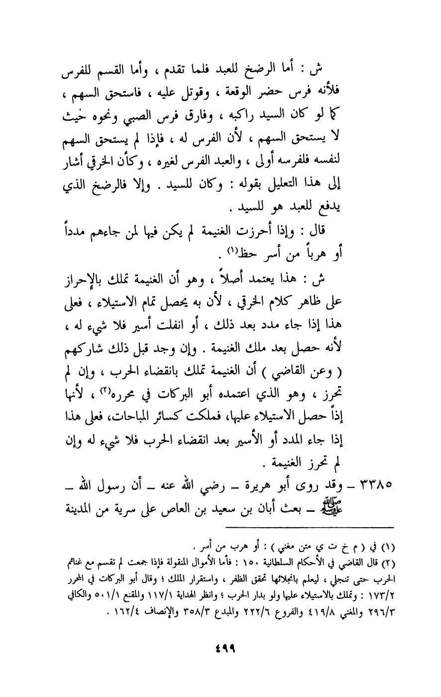 ش: هذا يعتمد أصلا، وهو أن الغنيمة تملك بالإحراز على ظاهر كلام الخرقي، لأن به يحصل تمام الاستيلاء، فعلى هذا إذا جاء مدد بعد ذلك، أو انفلت أسير فلا شيء له، لأنه حصل بعد ملك الغنيمة. وإن وجد قبل ذلك شاركهم (وعن القاضي) أن الغنيمة تملك بانقضاء الحرب، وإن لم تحرز، وهو الذي اعتمده أبو البركات في محرره، لأنها إذا حصل الاستيلاء عليها، فملكت كسائر المباحات، فعلى هذا إذا جاء المدد أو الأسير بعد انقضاء الحرب فلا شيء له وإن لم تحرز الغنيمة.