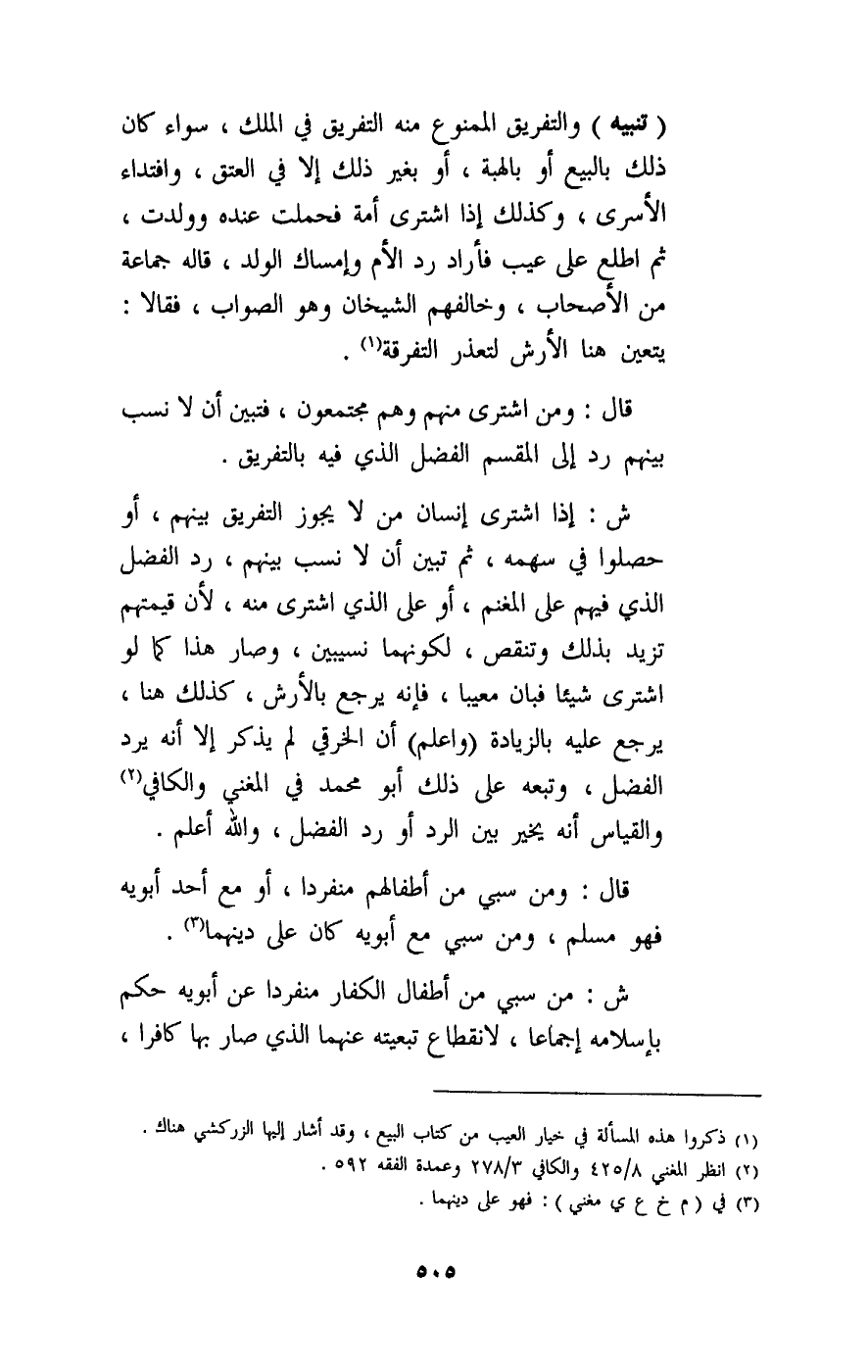 ش: إذا اشترى إنسان من لا يجوز التفريق بينهم، أو حصلوا في سهمه، ثم تبين أن لا نسب بينهم، رد الفضل الذي فيهم على المغنم، أو على الذي اشترى منه، لأن قيمتهم تزيد بذلك وتنقص، لكونهما نسيبين، وصار هذا كما لو اشترى شيئا فبان معيبا، فإنه يرجع بالأرش، كذلك هنا، يرجع عليه بالزيادة (واعلم) أن الخرقي لم يذكر إلا أنه يرد الفضل، وتبعه على ذلك أبو محمد في المغني والكافي، والقياس أنه يخير بين الرد أو رد الفضل، والله أعلم.
