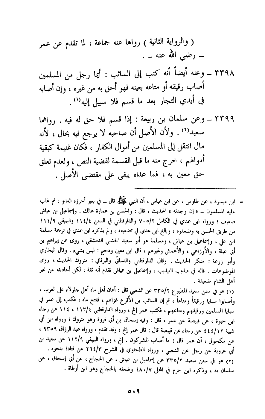 3398 - وعنه أيضا أنه كتب إلى السائب: أيما رجل من المسلمين أصاب رقيقه أو متاعه بعينه فهو أحق به من غيره، وإن أصابه في أيدي التجار بعدما قسم فلا سبيل إليه.