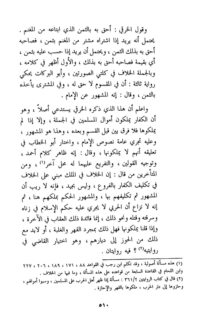 وقول الخرقي: أحق به بالثمن الذي ابتاعه من المغنم، يحتمل أنه يريد إذا اشتراه مشتر من المغنم بثمن، فصاحبه أحق به بذلك الثمن، ويحتمل أن يريد إذا حسب عليه بثمن، أي بقيمة فصاحبه أحق به بذلك، والأول أظهر في كلامه، وبالجملة الخلاف في كلتي الصورتين، وأبو البركات يحكي رواية ثالثة: أن في المقسوم لا حق له، وفي المشترى يأخذه بالثمن، وقال: إنه المشهور عن الإمام. واعلم أن هذا الذي ذكره الخرقي يستدعي أصلا، وهو أن الكفار يملكون أموال المسلمين في الجملة، وإلا إذا لم يملكوها فلا فرق بين قبل القسم وبعده، وهذا هو المشهور، وعليه تجري عامة نصوص الإمام، واختار أبو الخطاب في تعليقه أنهم لا يملكونها، وقال: إنه ظاهر كلام أحمد، وتوجيه القولين، والتفريع عليهما له محل آخر، ومن المتأخرين من قال: إن الخلاف في الملك مبني على الخلاف في تكليف الكفار بالفروع، وليس بجيد، فإنه لا ريب أن المشهور ثم تكليفهم بها، والمشهور الحكم بملكهم هنا، ثم إنه لا نزاع أن الحربي لا يجري عليه حكم الإسلام في زناه وسرقته وقتله ونحو ذلك، إنما فائدة ذلك العقاب في الآخرة، وإذا قلنا يملكونها فهل ذلك بمجرد القهر والغلبة، أو لا بد مع ذلك من الحوز إلى ديارهم، وهو اختيار القاضي في روايتيه؟ فيه روايتان.