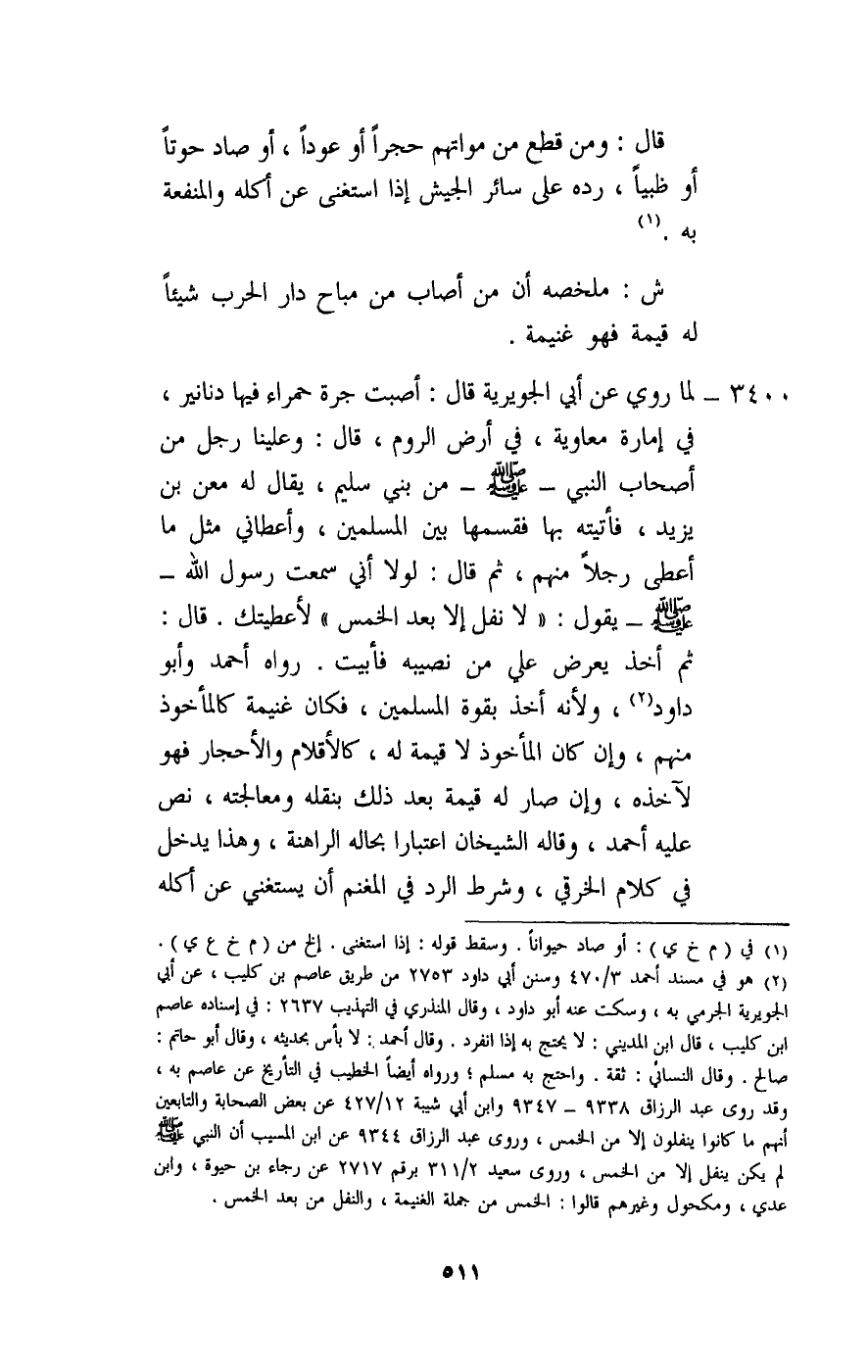 3400 - لما «روي عن أبي الجويرية قال: أصبت جرة حمراء فيها دنانير، في إمارة معاوية، في أرض الروم، قال: وعلينا رجل من أصحاب النبي - صَلَّى اللَّهُ عَلَيْهِ وَسَلَّمَ - من بني سليم، يقال له معن بن يزيد، فأتيته بها فقسمها بين المسلمين، وأعطاني مثل ما أعطى رجلا منهم، ثم قال: لولا أني سمعت رسول الله - صَلَّى اللَّهُ عَلَيْهِ وَسَلَّمَ - يقول: «لا نفل إلا بعد الخمس» لأعطيتك.
