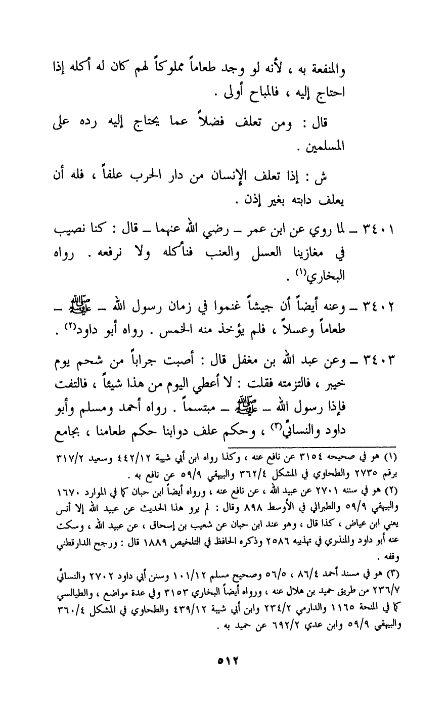3402 - «وعنه أيضا أن جيشا غنموا في زمان رسول الله - صَلَّى اللَّهُ عَلَيْهِ وَسَلَّمَ - طعاما وعسلا، فلم يؤخذ منه الخمس» . رواه أبو داود.