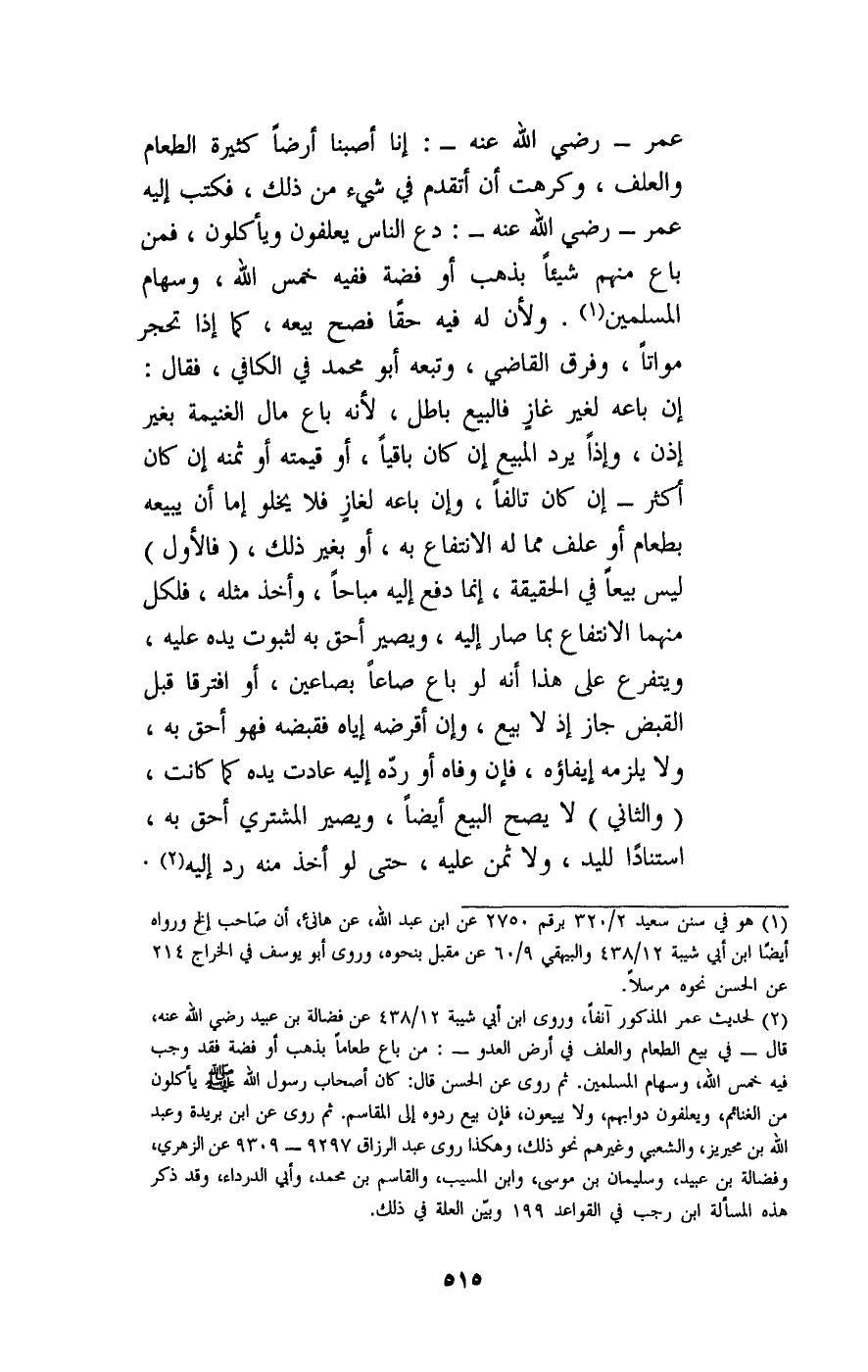 عمر - رَضِيَ اللَّهُ عَنْهُ -: إنا أصبنا أرضا كثيرة الطعام والعلف، وكرهت أن أتقدم في شيء من ذلك، فكتب إليه عمر - رَضِيَ اللَّهُ عَنْهُ -: دع الناس يعلفون ويأكلون، فمن باع منهم شيئا بذهب أو فضة ففيه خمس الله، وسهام المسلمين. ولأن له فيه حقا فصح بيعه، كما إذا تحجر مواتا، وفرق القاضي، وتبعه أبو محمد في الكافي، فقال: إن باعه لغير غاز فالبيع باطل، لأنه باع مال الغنيمة بغير إذن، وإذا يرد المبيع إن كان باقيا، أو قيمته أو ثمنه إن كان أكثر - إن كان تالفا، وإن باعه لغاز فلا يخلو إما أن يبيعه بطعام أو علف مما له الانتفاع به، أو بغير لك. (فالأول) ليس بيعا في الحقيقة، إنما دفع إليه مباحا، وأخذ مثله، فلكل منهما الانتفاع بما صار إليه، ويصير أحق به لثبوت يده عليه، ويتفرع على هذا أنه لو باع صاعا بصاعين، أو افترقا قبل القبض جاز إذ لا بيع، وإن أقرضه إياه فقبضه فهو أحق به، ولا يلزمه إيفاؤه، فإن وفاه أو رده إليه عادت يده كما كانت، (والثاني) لا يصح البيع أيضا، ويصير المشتري أحق به، استنادا لليد، ولا ثمن عليه، حتى لو أخذ منه رد إليه.