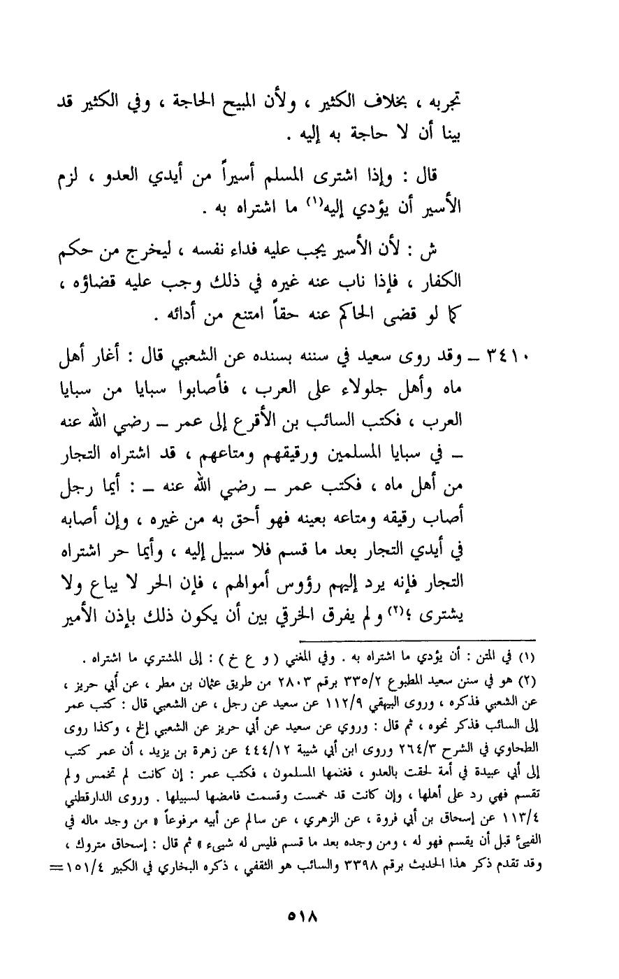 3410 - وقد روى سعيد في سننه بسنده عن الشعبي قال: أغار أهل ماه وأهل جلولاء على العرب، فأصابوا سبايا من سبايا العرب، فكتب السائب بن الأقرع إلى عمر - رَضِيَ اللَّهُ عَنْهُ - في سبايا المسلمين ورقيقهم ومتاعهم، قد اشتراه التجار من أهل ماه، فكتب عمر - رَضِيَ اللَّهُ عَنْهُ -: أيما رجل أصاب رقيقه ومتاعه بعينه فهو أحق به من غيره، وإن أصابه في أيدي التجار بعدما قسم فلا سبيل إليه، وأيما حر اشتراه التجار فإنه يرد إليهم رءوس أموالهم، فإن الحر لا يباع ولا يشترى؛ ولم يفرق الخرقي بين أن يكون ذلك بإذن الأمير