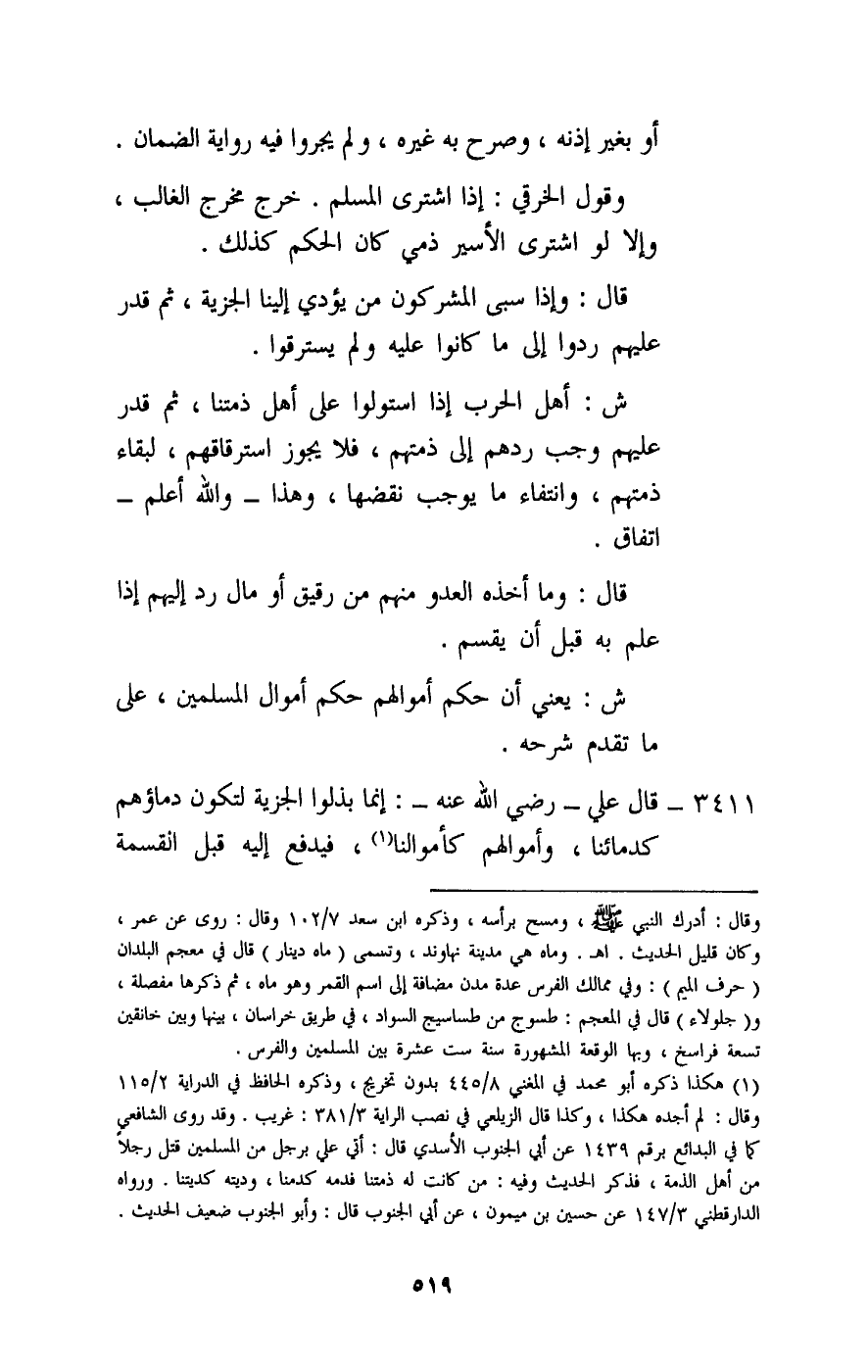 3411 - قال علي - رَضِيَ اللَّهُ عَنْهُ -: إنما بذلوا الجزية لتكون دماؤهم كدمائنا، وأموالهم كأموالنا، فيدفع إليه قبل القسمة