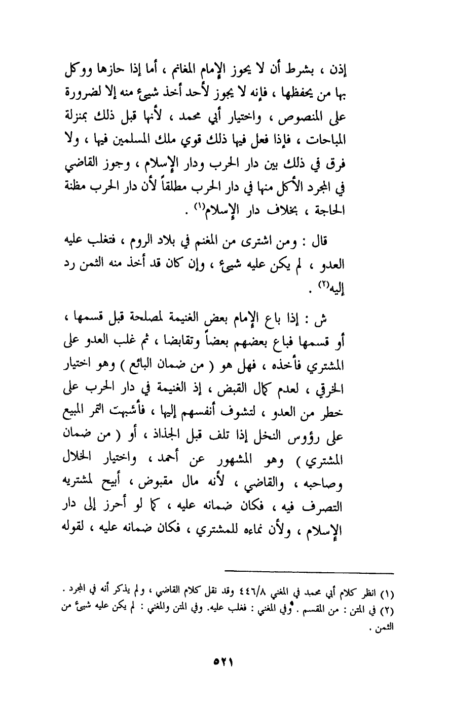 ش: إذا باع الإمام بعض الغنيمة لمصلحة قبل قسمها، أو قسمها فباع بعضهم بعضا وتقابضا، ثم غلب العدو على المشتري فأخذه، فهل هو (من ضمان البائع) وهو اختيار الخرقي، لعدم كمال القبض، إذ الغنيمة في دار الحرب على خطر من العدو، لتشوف أنفسهم إليها، فأشبهت التمر المبيع على رؤوس النخل إذا تلف قبل الجذاذ.