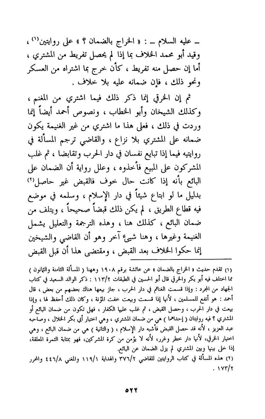 - عَلَيْهِ السَّلَامُ -: «الخراج بالضمان؟» . على روايتين، وقيد أبو محمد الخلاف بما إذا لم يحصل تفريط من المشتري، أما إن حصل منه تفريط، كأن خرج بما اشتراه من العسكر ونحو ذلك، فإن ضمانه عليه بلا خلاف. ثم إن الخرقي إنما ذكر ذلك فيما اشتري من المغنم، وكذلك الشيخان وأبو الخطاب، ونصوص أحمد أيضا إنما وردت في ذلك، فعلى هذا ما اشتري من غير الغنيمة يكون ضمانه على المشتري بلا نزاع، والقاضي ترجم المسألة في روايتيه فيما إذا تبايع نفسان في دار الحرب وتقابضا، ثم غلب المشركون على المبيع فأخذوه.