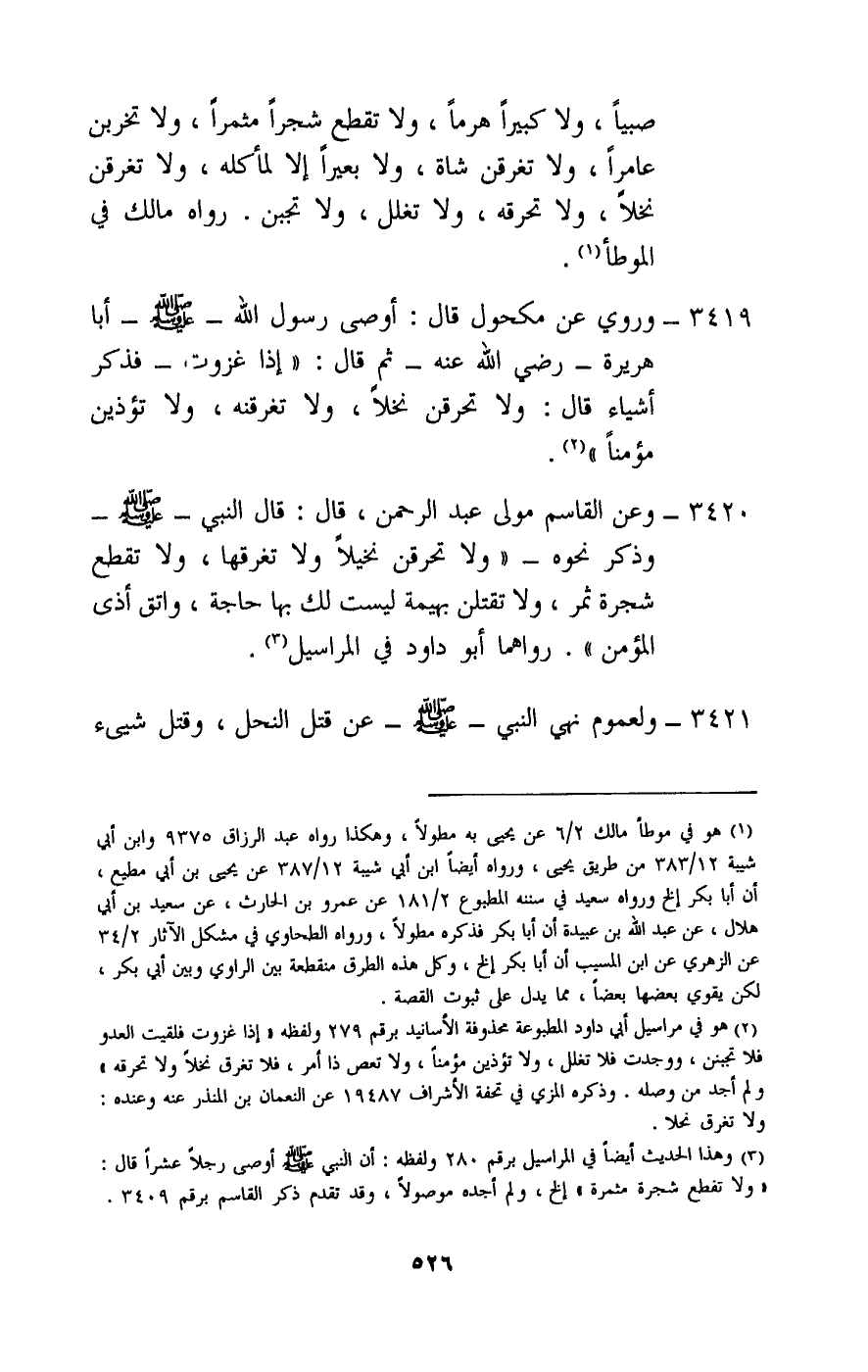 3420 - وعن القاسم مولى عبد الرحمن، قال: قال النبي - صَلَّى اللَّهُ عَلَيْهِ وَسَلَّمَ - وذكر نحوه: - «ولا تحرقن نخيلا ولا تغرقها، ولا تقطع شجرة ثمر، ولا تقتلن بهيمة ليست لك بها حاجة، واتق أذى المؤمن» . رواهما أبو داود في المراسيل.