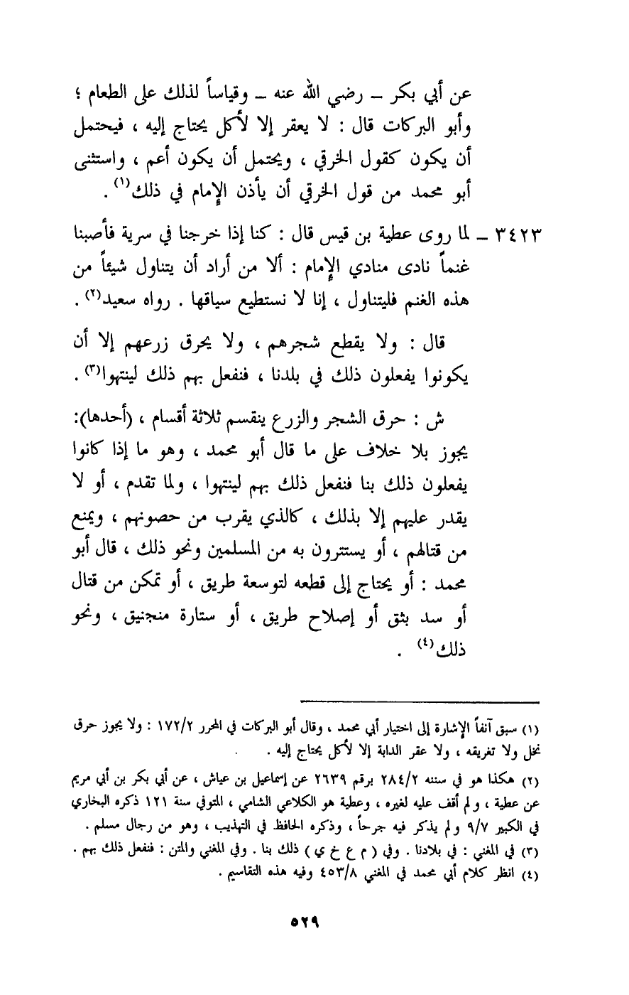 3423 - لما روى عطية بن قيس قال: كنا إذا خرجنا في سرية فأصبنا غنما نادى منادي الإمام: ألا من أراد أن يتناول شيئا من هذه الغنم فليتناول، إنا لا نستطيع سياقها. رواه سعيد.