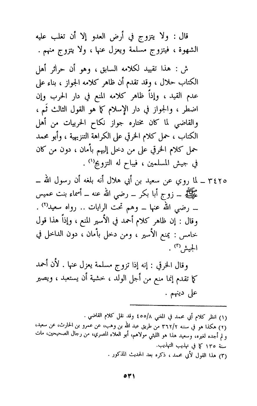 3425 - لما «روي عن سعيد بن أبي هلال أنه بلغه أن رسول الله - صَلَّى اللَّهُ عَلَيْهِ وَسَلَّمَ - زوج أبا بكر - رَضِيَ اللَّهُ عَنْهُ - أسماء بنت عميس - رَضِيَ اللَّهُ عَنْهَا - وهم تحت الرايات» . . رواه سعيد. وقال: إن ظاهر كلام أحمد في الأسير المنع.