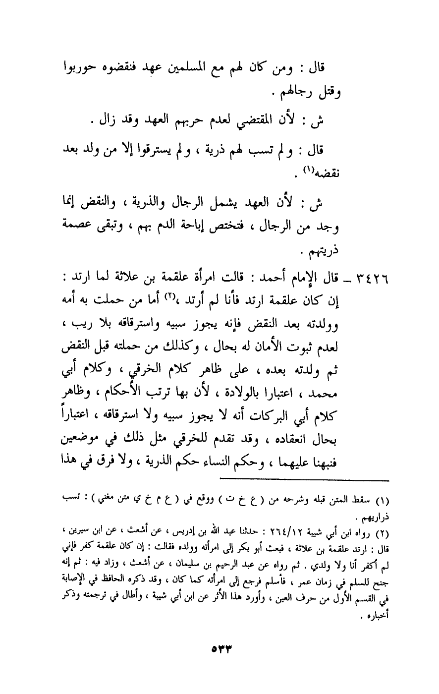 3426 - قال الإمام أحمد: قالت امرأة علقمة بن علاثة لما ارتد: إن كان علقمة ارتد فأنا لم أرتد، أما من حملت به أمه وولدته بعد النقض فإنه يجوز سبيه واسترقاقه بلا ريب، لعدم ثبوت الأمان له بحال، وكذلك من حملته قبل النقض ثم ولدته بعده، على ظاهر كلام الخرقي، وكلام أبي محمد، اعتبارا بالولادة، لأن بها ترتب الأحكام، وظاهر كلام أبي البركات أنه لا يجوز سبيه ولا استرقاقه، اعتبارا بحال انعقاده، وقد تقدم للخرقي مثل ذلك في موضعين فنبهنا عليهما، وحكم النساء حكم الذرية، ولا فرق في هذا