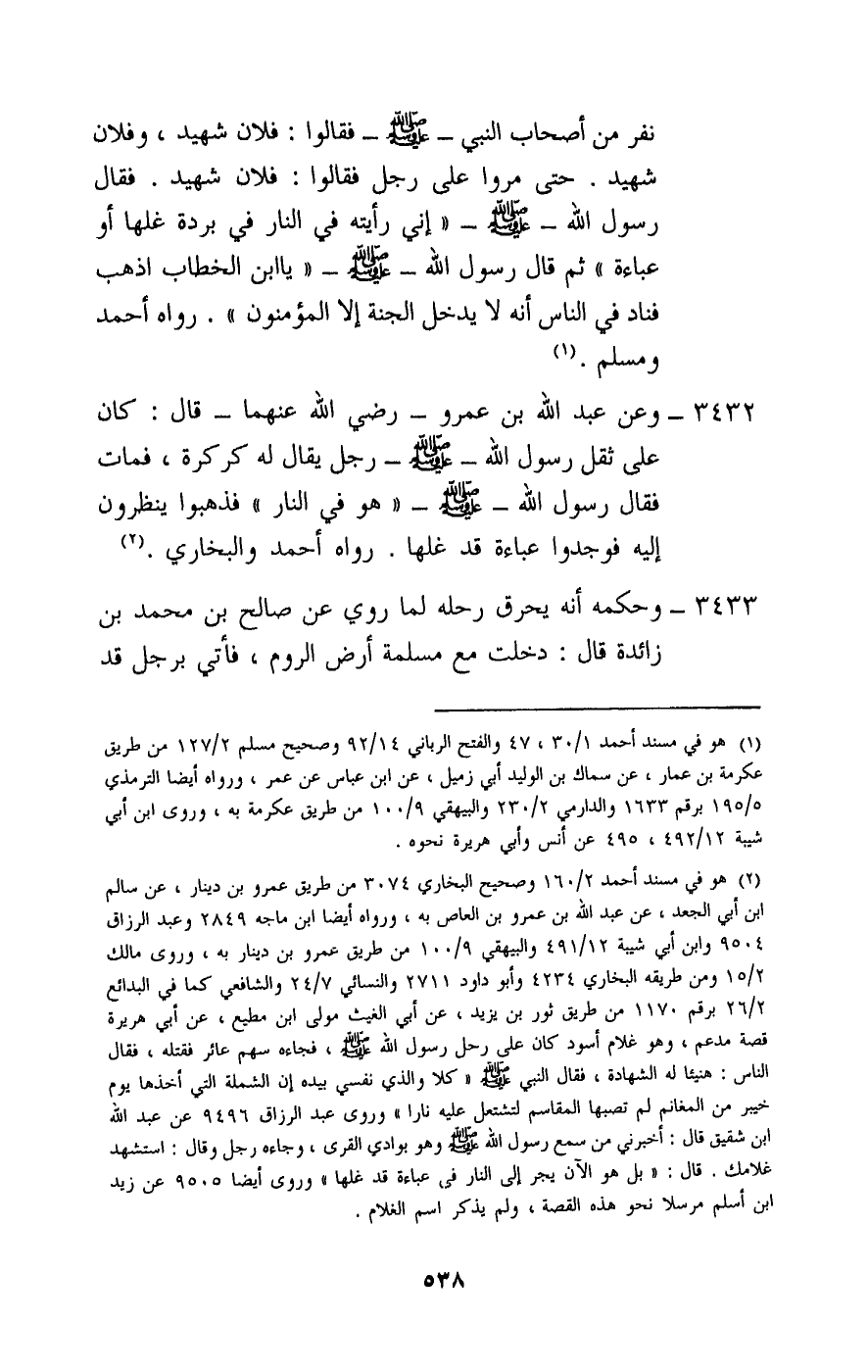 نفر من أصحاب النبي - صَلَّى اللَّهُ عَلَيْهِ وَسَلَّمَ - فقالوا: فلان شهيد، وفلان شهيد. حتى مروا على رجل فقالوا: فلان شهيد. فقال رسول الله - صَلَّى اللَّهُ عَلَيْهِ وَسَلَّمَ -: «إني رأيته في النار في بردة غلها، أو عباءة» . ثم قال رسول الله - صَلَّى اللَّهُ عَلَيْهِ وَسَلَّمَ -: «يا ابن الخطاب اذهب فناد في الناس أنه لا يدخل الجنة إلا المؤمنون» » . رواه أحمد ومسلم.